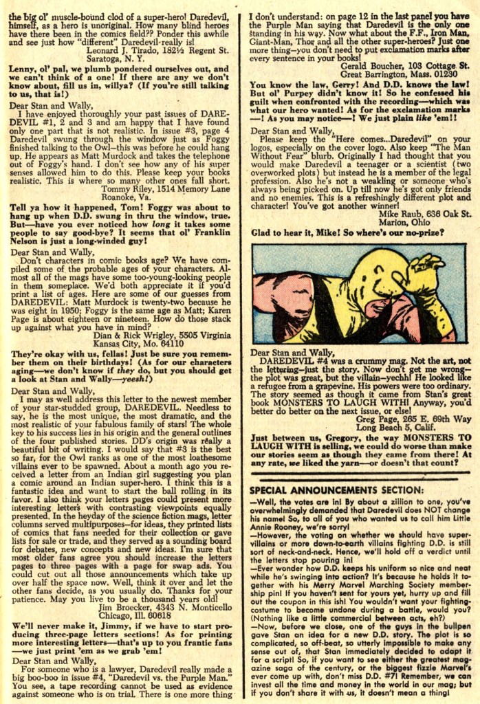 And the issue wraps up with another one of Lee’s chatty, gregarious letters pages. From the tentative first stabs at these, he’s perfected the rhythm of his Marvel patter and the fashion in which he can intersperse plugs for other Marvel titles (such as the Mighty Marvel Checklist) amidst the other tomfoolery in a way that made it seem less like a reader was being shilled to. The Special Announcements Section is here as well–it would evolve into the Bullpen Bulletins page in a number of months, but it’s already got the trappings here–a mix of more plugs, some insider gossip and cornball gags. Not to mention a typical hard-sell from Stan on the next issue of DAREDEVIL, the copy to which makes it apparent that he has no idea what the story is going to be about. It’s astonishing how often Lee pulled this particular trick, and also how often I and readers like me fell for it.