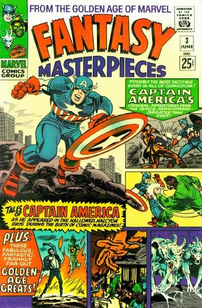 Marvel founder and owner Martin Goodman wasn’t about to give up his ownership of Captain America without a fight, and he began reprinting the earliest Captain America stories (or the earliest ones for which any reproduction materials could be sourced) in the pages of FANTASY MASTERPIECES, to re-establish his rights to them. He and editor Stan Lee did remove the Joe Simon & Jack Kirby credit form all of these stories as a matter of course, despite the fact that Marvel by then point made it a habit to credit the creators on its titles.