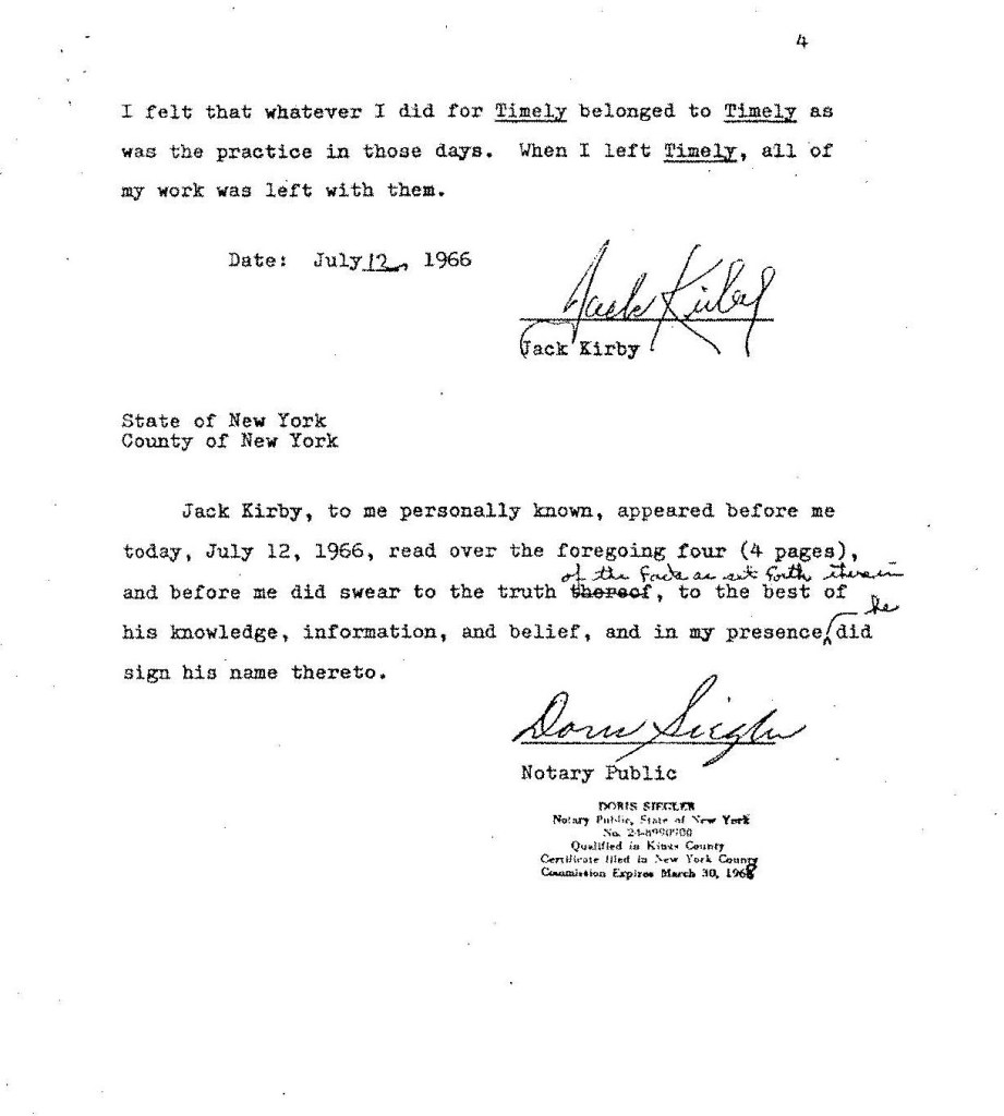 Goodman also prevailed upon Jack Kirby, then working as the backbone of the Marvel creative line, to testify on Marvel’s behalf, indicating that if Simon were to win, the firm might suffer greatly and impact on Kirby’s ability to make a living. This testimony caused no end of headaches for Kirby in later years, as it both predates any later recountings of these and similar events and is at odds with how Kirby would recall these events in later years.