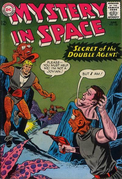This cover to the 100th issue of the long-running science fiction anthology title MYSTERY IN SPACE is simultaneously totally on-the-nose while simultaneously being intriguing as hell. Yes, this moment is silly, but it promises an exciting story within, one laden with cross and double-cross. In many cases, though, once a buyer had paid their dimes and pennies, they were too often confronted with the reality that the image that so enticed them into picking up the issue was just a one-panel diversion from the main story, contrived so as to justify the cover. This was the downside of the notion of coming up with the cover image first, but it’s really an editorial fault first and foremost. The editor commissioned a story based on a given cover, and he or she could have insisted that the subject matter of that story hew a bit more centrally to the idea being displayed. The fact that the editors seldom did underscores the fact that most people working in the industry at that time felt that the cover was what sold the magazine, and that content was largely irrelevant so long as it met a certain standard. It was this thinking that caused DC to give up a lot of ground as tastes changed in the 1960s. This cover was penciled by Dick Dillin and inked by Sheldon Moldoff, a combination that I don’t recall having seen before this. Dillin was a journeyman, best remembered for his long stint on JUSTICE LEAGUE OF AMERICA, though he served an equally long tenure on BLACKHAWK prior to that, dating to before DC purchased that property from Quality Comics, which was shuttering its operation.