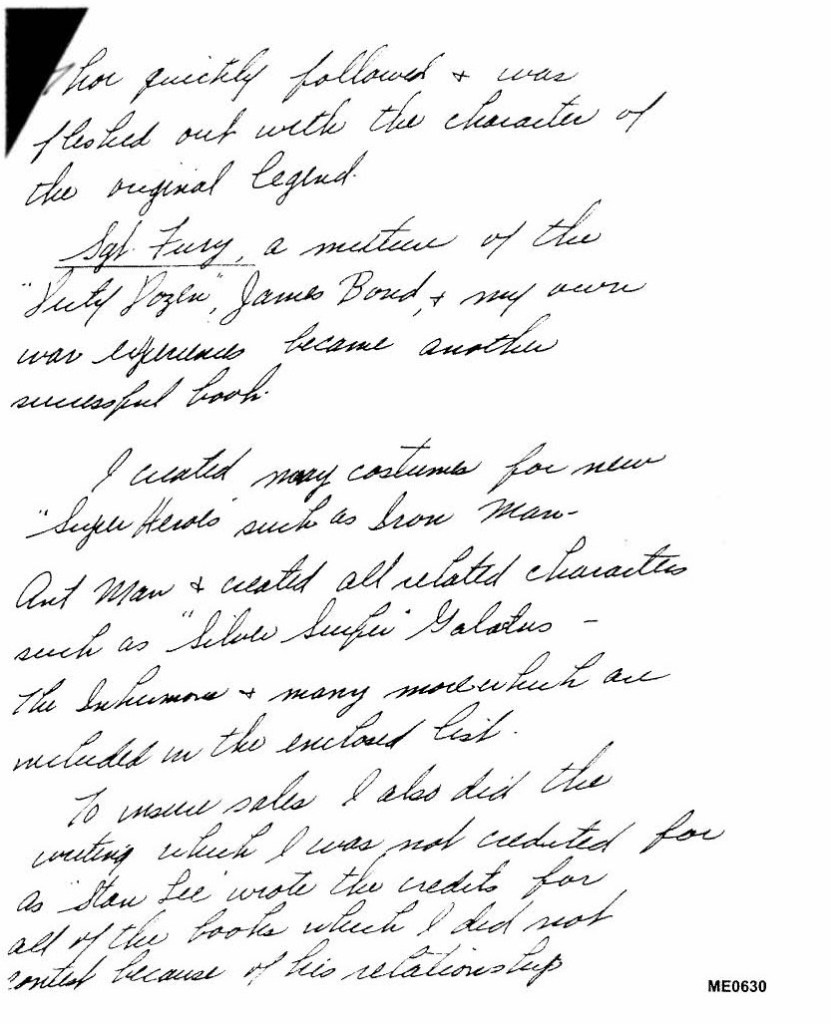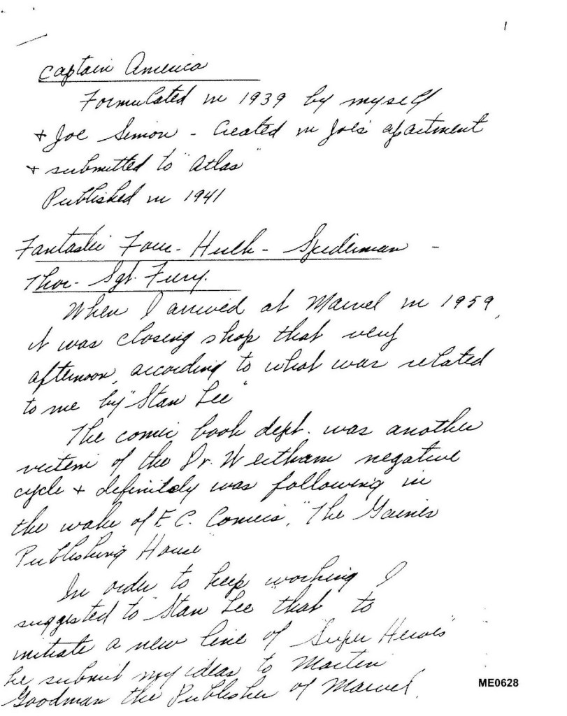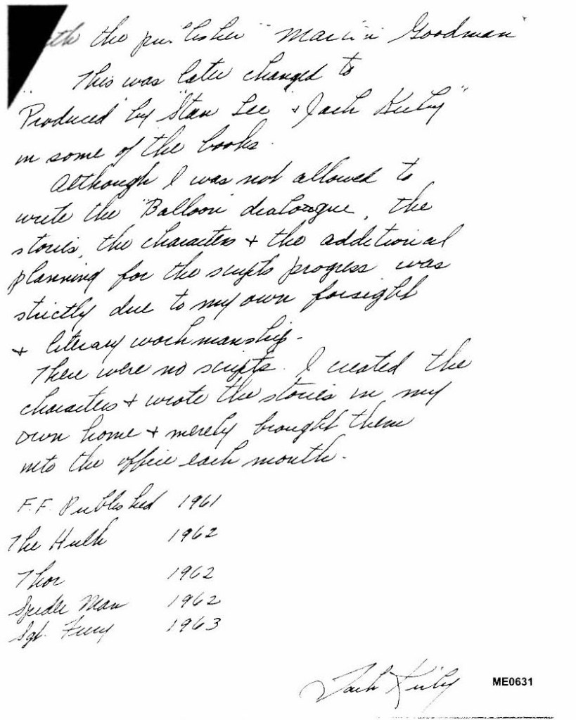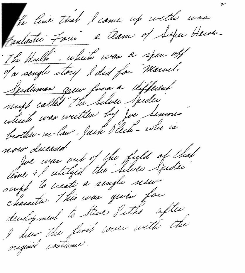 Kirby began to become more vocal in his interviews in this period about his full role in those early Marvel days and the creations of the characters, beginning with one printed in Kitchen Sink Press’ THE SPIRIT Magazine #39 with his old boss, Will Eisner. At some point during this time, Kirby hand-wrote a summary of his perspective on the creations of the assorted Marvel characters. The particular date at which he did this is unknown, but it appears to have happened in the early 1980s.