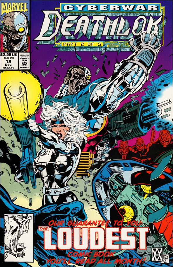 DEATHLOK #18: That cover copy is fun, but largely unreadable against that background. Anyway, the issue with this particular book wasn’t actually my fault, but it was the first time I’d experienced that world-ending panic of finding out about a situation and realizing that it was possibly going to cost you your job. You see, in the days when this issue of DEATHLOK was put together, everything was still being pasted up on the actual boards to be sent to press–nothing was yet digital as it is today. And for most Marvel titles, there would be two editions, one for the Direct Sales marketplace of comic book specialty shops, and one for the Newsstand Marketplace of candy stores and 7-11s and newsstands. What that meant is that a different corner box and UPC box had to be put together for each version, one for the Direct Market (seen on the copy above) and one for the Newsstand Market that would include the distributor’s codes and other such info. The way this was done is that one version was pasted up directly onto the art board, and the other was packaged in an envelope attached to the back, to be stripped in at the printer.