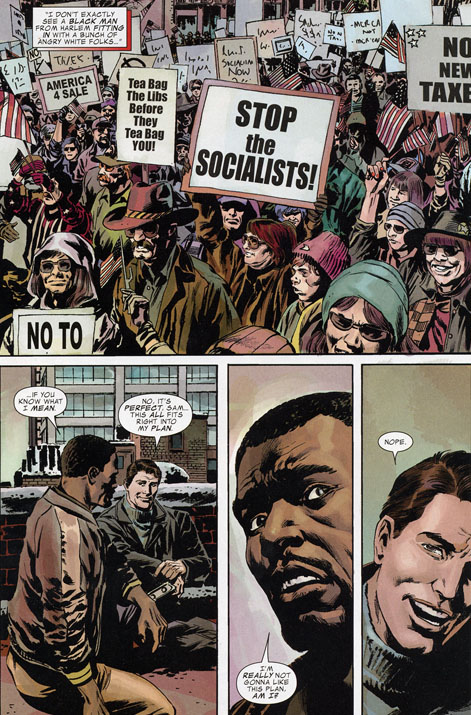 In any case, the specifics of the storyline don’t have a whole lot to do with what actually went down here. See, on a particular page of this issue, artist Luke Ross had drawn a bunch of protestors holding up signs, but he’d left the text itself to be filled in by the letterer. Ed hadn’t specified any particular copy for those signs, and it was late on a Friday night as myself and my assistant were scrambling to get this book and other books off to the printer so that we could go home for the weekend. So we asked the letterer to fill in some text on those signs, he googled protests and pulled some slogans off of recent images that he found, and we sent the book to print and didn’t think much about it. Actually, that’s not quite true–when we sent a copy of the finished book to Ed to look over, he was uneasy with the reference to the Tea Party on one of the signs, and so we went and changed it for its eventual publication in collected edition form. And then we didn’t think anything much of it.