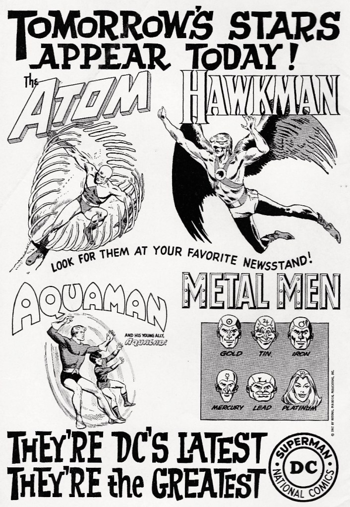 The inside cover on this issue runs a house ad touting DC’s newest creations, the Atom, Hawkman, Aquaman and the Metal Men. It’s difficult to remember when those books and characters were brand new, but that’s where we were when this issue saw print. (New, of course, being a relative term; The Atom and Hawkman were re-envisionings of 1940s characters of teh same name, and Aquaman had been around for decades but had only just been given his own title. Of these four, only the Metal Men were truly new.)