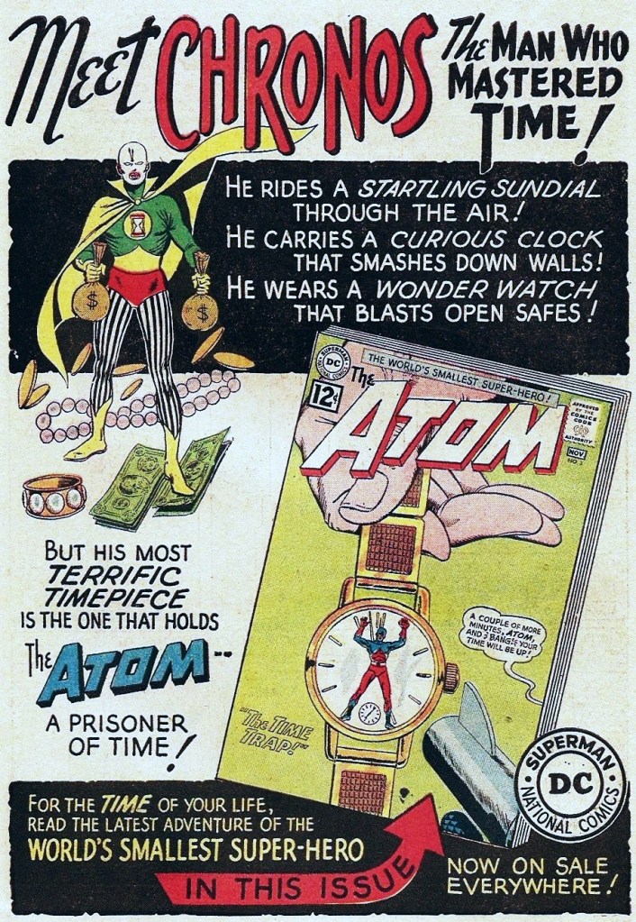 A pause here for this terrific house ad that separates the two chapters of the lead FLASH story. As usual, this page was executed by DC’s master of typography Ira Schnapp, and it’s a marvel–both showing off the actual cover that readers should look for at their local newsstand while also previewing the villain they’ll find in its pages and describing the adventure in tantalizing detail. I don’t know that shrinking to tiny size is teh most compelling super-power ever put to paper, but with covers and ads like this one, you can understand how THE ATOM was published for the whole of the 1960s. Those striped pants on Chronos are a weird design choice on the part of artist Gil Kane, though.