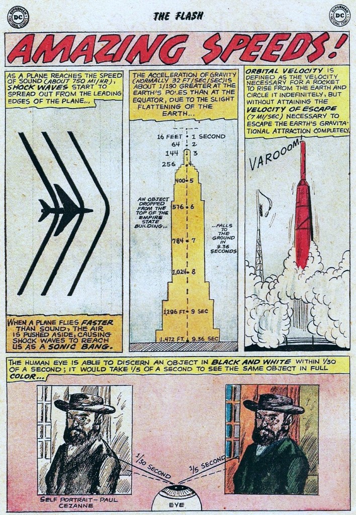 We also get one of editor Schwartz’s single page filler features at this point, devoted (as was often the case in the pages of FLASH) to scientific feats of extreme velocity. These science-based fact pages somehow made the daffy science often used in the actual stories seem a bit more plausible, especially when Schwartz and his writers would sprinkle these same kinds of factoids into the proceedings to help provide them with verisimilitude.