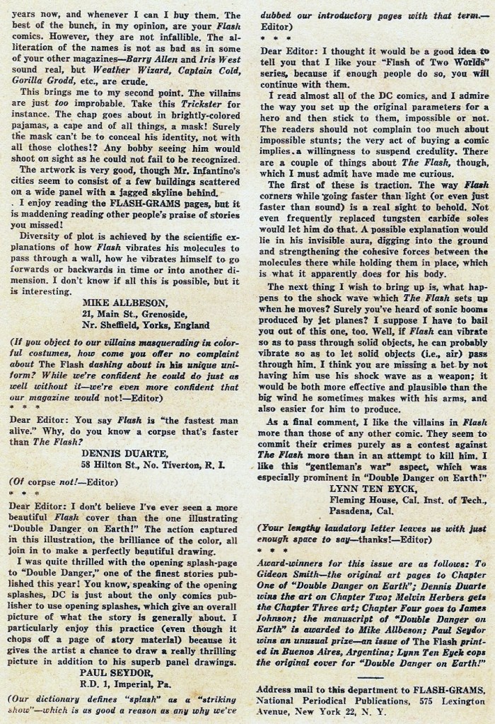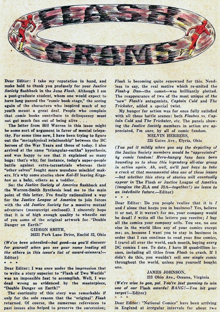Next came the two-page letters page that Schwartz ran in his heroic titles. This particular entry comes from a period that’s perhaps difficult to fathom so many years later. Every issue, editor Schwartz would reward the best letter writers with the original artwork to entire stories and covers to the issues in question. The good part about this is that, during a period in which DC routinely destroyed much of its original art, seeing no value on it, this gift-giving allowed a bunch of it to survive to the present day. On the other hand, it would have been nice to have seen it returned to the artists in question, as would become industry standard in the following decade. These letter writers were awarded the original artwork to the second Flash team-up with his golden Age counterpart in FLASH #129–so if you see any of that artwork for sale on the original art market, this is its provenance.