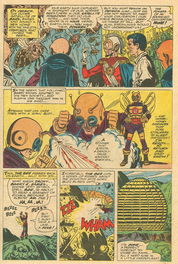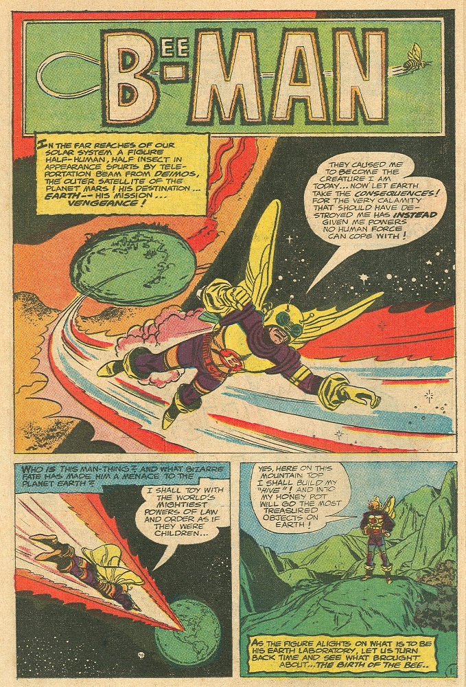 Take this guy, B-Man (or Bee-Man, depending on how you want to look at it.) He was aerospace engineer Barry E. Eames, who misdirected a probe rocket sent to pick up samples from Mars so that he could pillage its contents for his own profit. What he got was swarmed by a nest of alien bees, who stung him, somehow putting him into contact with an advanced civilization living on Deimos, Mars’ moon. The aliens bring Eames to their world and tell him that he now has the same attributes as the bees which stung him. They outfit him in an ugly-as-sin costume filled with gadgets and send him back to Earth as their spy and envoy. So he’s not a super hero per se, but rather more of a menace in the manner of Prince Namor in his earliest appearances.