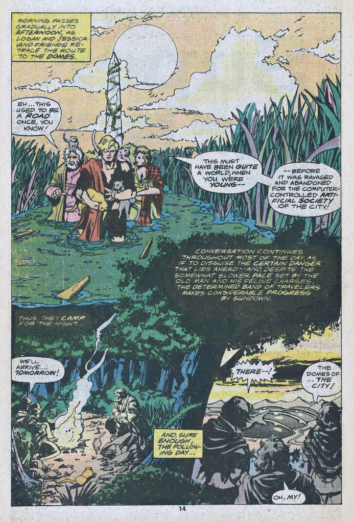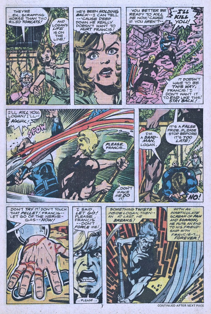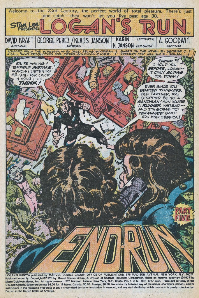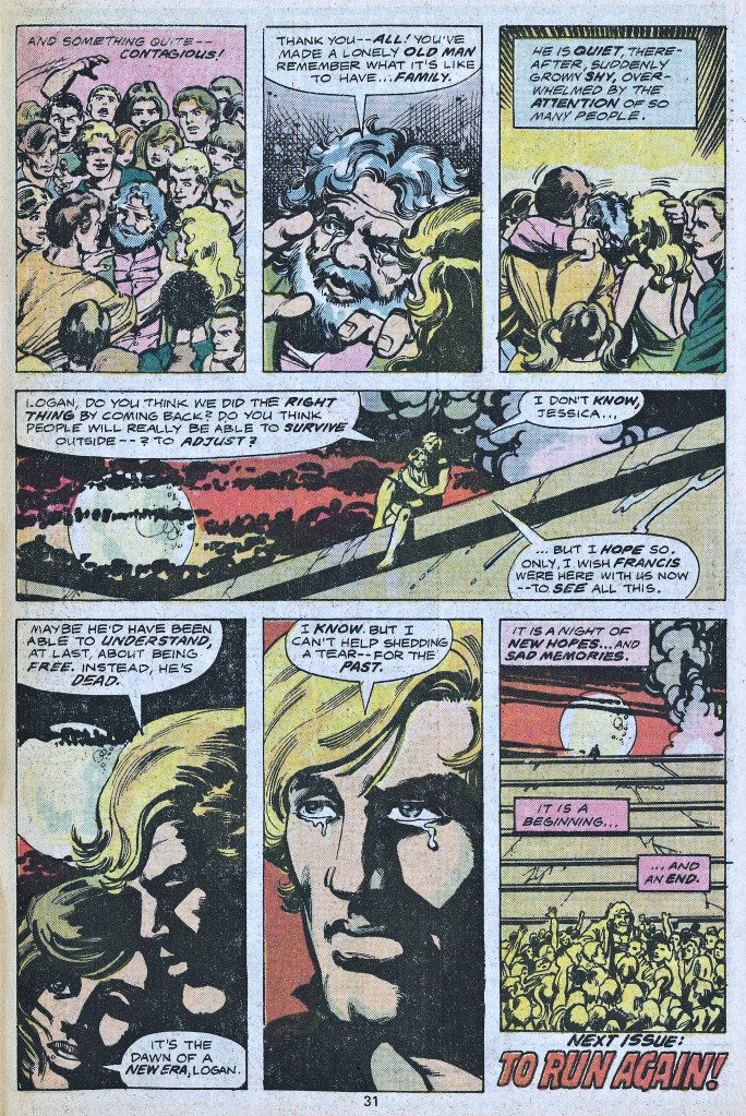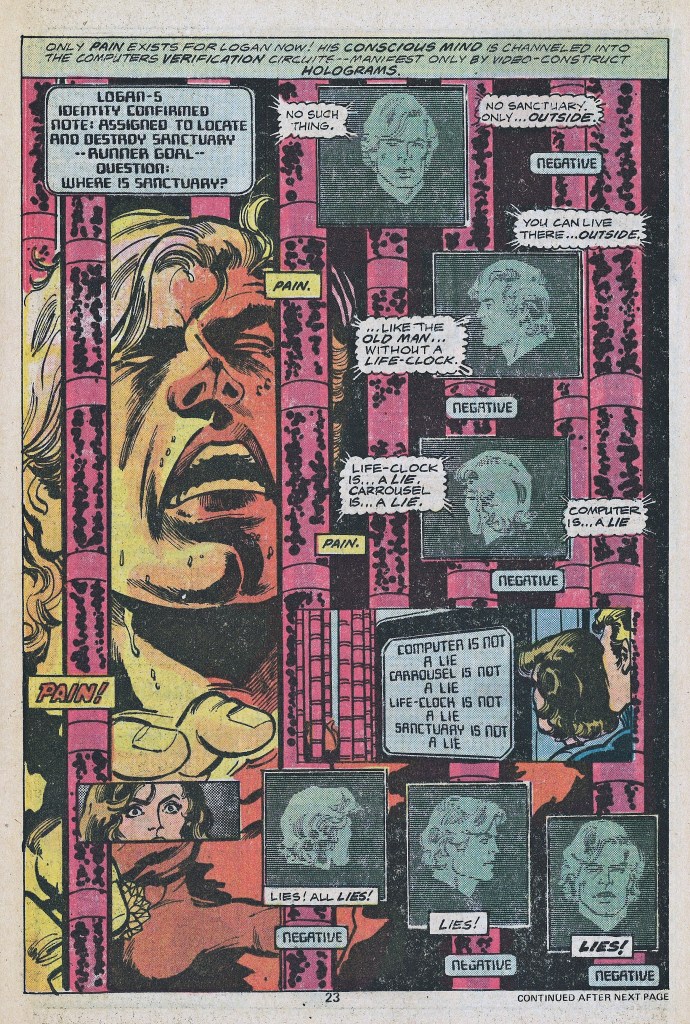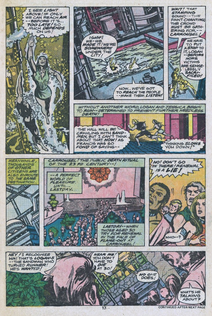 Also, I believe part of the reason the series was canceled after seven issues was because MGM caught wind that Marvel was continuing the series past the end of the movie and said “Hey, whoa! We gave you permission to adapt the movie. Nobody said anything about continuing past that. Stop.” I expect if sales had been remarkable enough, Marvel would’ve fought the edict, but they pretty much just said okey dokey and pulled the plug. It was too bad, because the story was heading in an interesting direction, in which the citizens of the City, far from happy that Logan had shown them they didn’t have to happily submit to being killed at age 30, were pretty angry at him for destroying their way of life and were committed to living in the ruins of the City, despite nothing there working anymore because the computer that kept things in operation was destroyed.