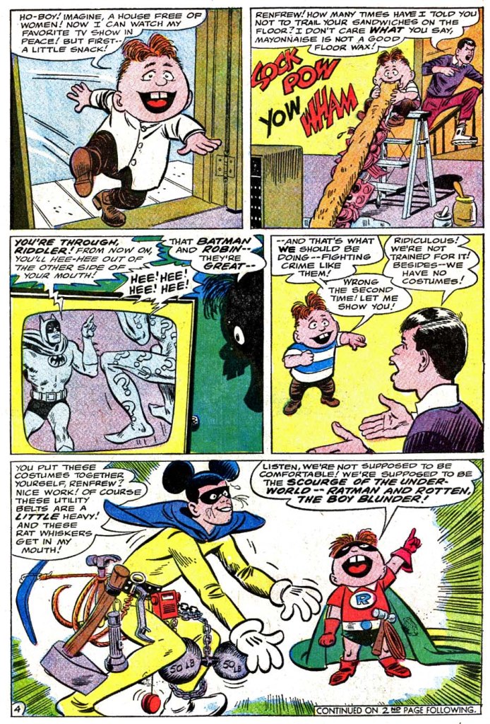 Inspired by the Batman TV show, Jerry and his nephew Renfrew assume the identities of costumed heroes themselves: Ratman and Rotten, the Boy Blunder. Their first foe is a criminal committing a series of daring thefts, the Kangaroo.
