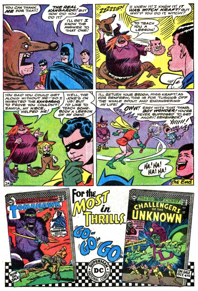 With no training and no skills to speak of, Jerry and Renfrew are no match for even a comedy super-villain, and are knocked around a bit. But rescue comes in teh form of a worn out Batman and Robin. The pair is exhausted because they’ve spent the entire night helping out assorted other imitators who were likewise inspired by their television series to fight crime. As can be seen in the 1/3 ad that closes out this page, Batman’s form had come to dominate even JUSTICE LEAGUE OF AMERICA covers–including the issue being advertised, a collection of reprints of early JLA stories that the Masked Manhunter barely appears in.