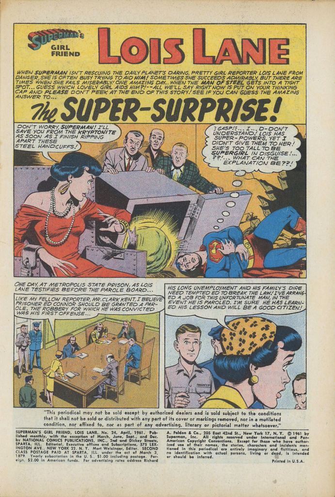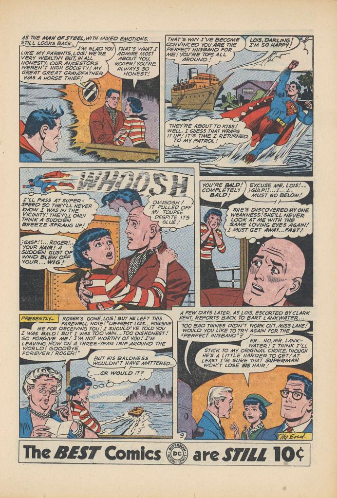 The cover makes it appear as though Lois will be matched up with Clark Kent, a situation whose irony would have been recognized by everyone. This is where the story proper takes a twist, though, as Lois’ match isn’t Clark at all, but rather Roger Warner, a sportsman who simply happens to look a lot like Kent. And he’s pretty great–he’s courageous, fit, intelligent, compassionate, and actually interested in her. And so, Lois begins to fall for her new beau. Even Superman approves of this guy. But of course, there’s a catch, and it turns up on the very last page. As Superman darts away at super-speed, his backlash succeeds in blowing Roger’s toupee off–the wealthy adventurer is bald, a crime that outweighs all of his other good qualities. Mortified that Lois now knows his shameful secret (which, let’s face it, she woudl have found out about were they to actually get married), Roger dashes off. Lois mutters that his baldness wouldn’t have mattered to her, though her thoughts follow that up with, “Or would it?” Lois was nothing if not shallow. Baldness was a recurring motif in the Superman titles, beginning of course with Lex Luthor but also turning up in stories such as this one. Mort Weisinger, of course, suffered from male pattern baldness, so what this says about ihs own self-reflection is relatively complex.