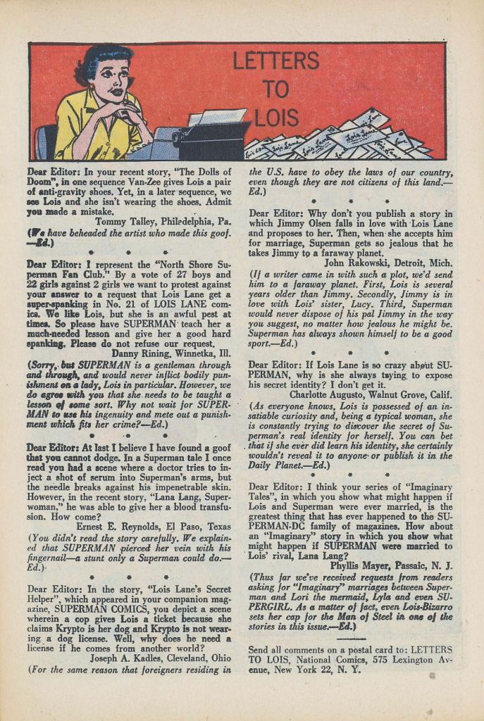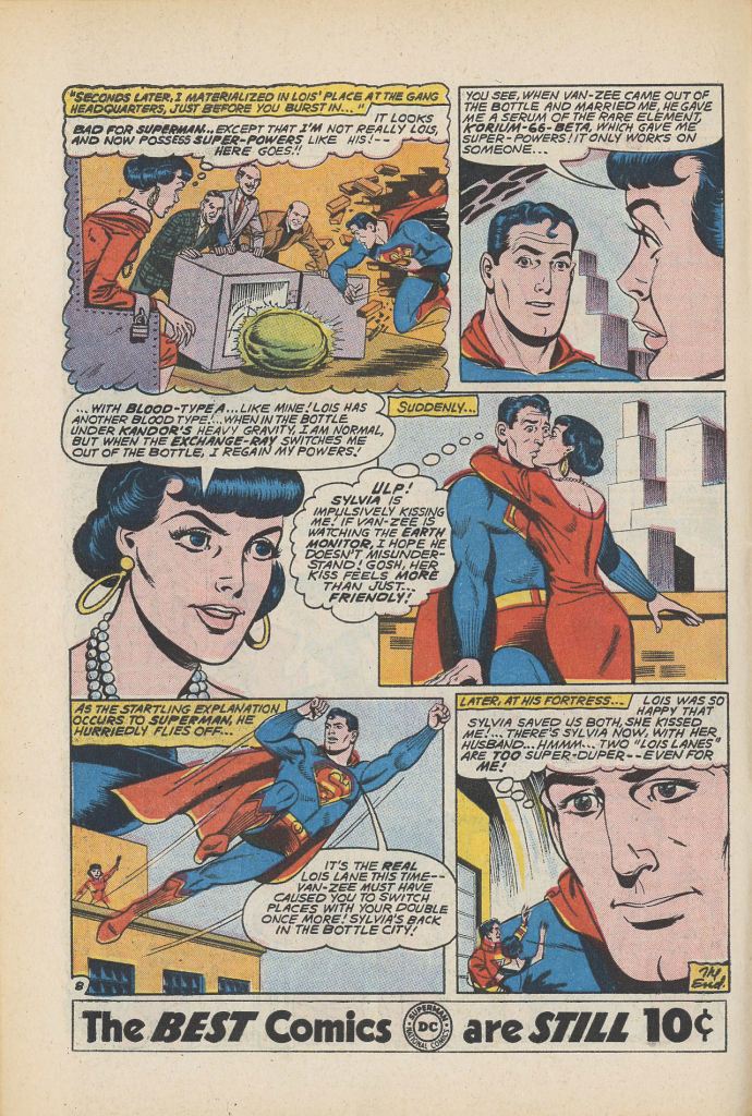 In this opening story, Lois goes undercover when she learns about a criminal’s plan to smuggle in some kryptonite in order to trap and kill Superman. But her disguised is uncovered and instead she winds up as bait for the Man of Tomorrow. And Superman does fall into the trap–but suddenly, Lois bursts her bonds as though possessing super-powers herself. Superman is astonished by this turn of events, and he confirms that she isn’t Supergirl in disguise, nor that he gave her these powers through a serum or similar means. The answer is convoluted: this isn’t Lois at all, but rather Sylvia, the wife of Van-Zee from the Bottle City of Kandor, who is Lois’ identical twin. Having seen that Lois was in danger, the pait had used an exchange ray to swap out Sylvia for Lois–Van-Zee had used a special ray to give Sylvia super-powers even though she was a regular human being earlier (the ray won’t work on the real Lois’ blood type, fortunately.) And so, the day is saved. Silly and lightweight, but a little mystery that turns upon the details of this larger mythology that Mort and his creators were crafting. This last page contains a bottom strap that notes that the DC books are still 10 cents each–a deliberate jab at rival publisher Dell, who had been the leader in the field until they were forced by economics to raise their prices, and they went up to 15 cents, which killed their sales. The DC books were similarly in for a price increase shortly after this issue went on sale.