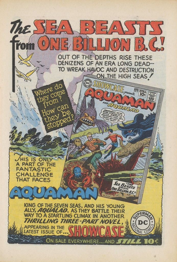 There’s also this great full-page ad for one of the SHOWCASE try-out appearances of Aquaman, a character that Mort himself had originated almost twenty years before. He’d hung on through the super hero downturn of the 1950s, becoming one of teh very few to be in continuous publication during that time. But he was a perennial back-pager, his stories limited to only a few short pages. Going book-length in SHOWCASE represented, if you will, a sea change for the character, and he earned his own regular title shortly thereafter. Being featured regularly in JUSTICE LEAGUE OF AMERICA no doubt helped with tis as well.