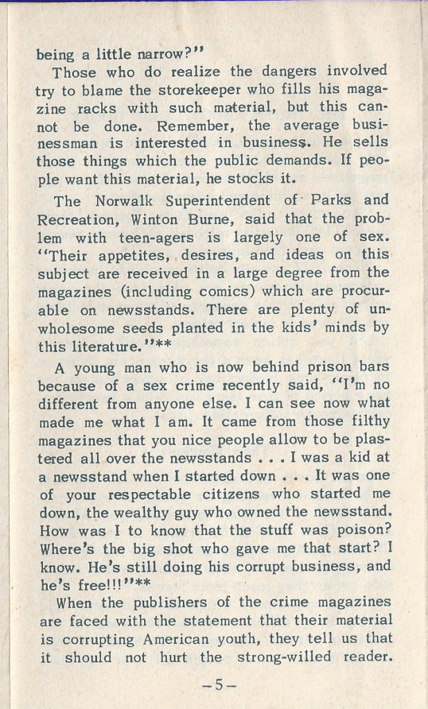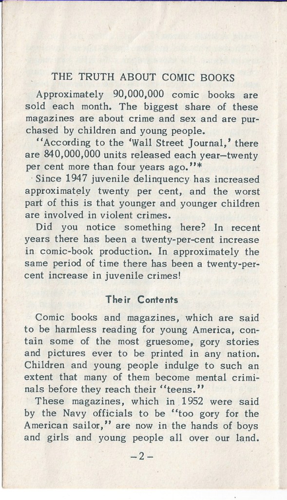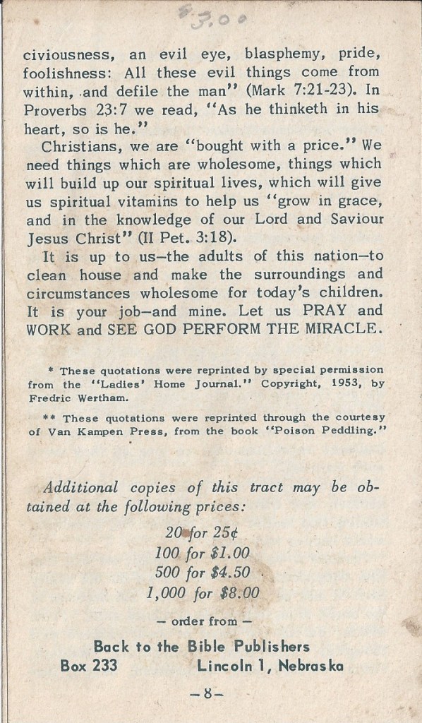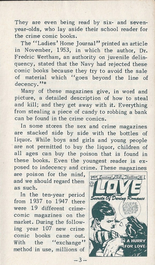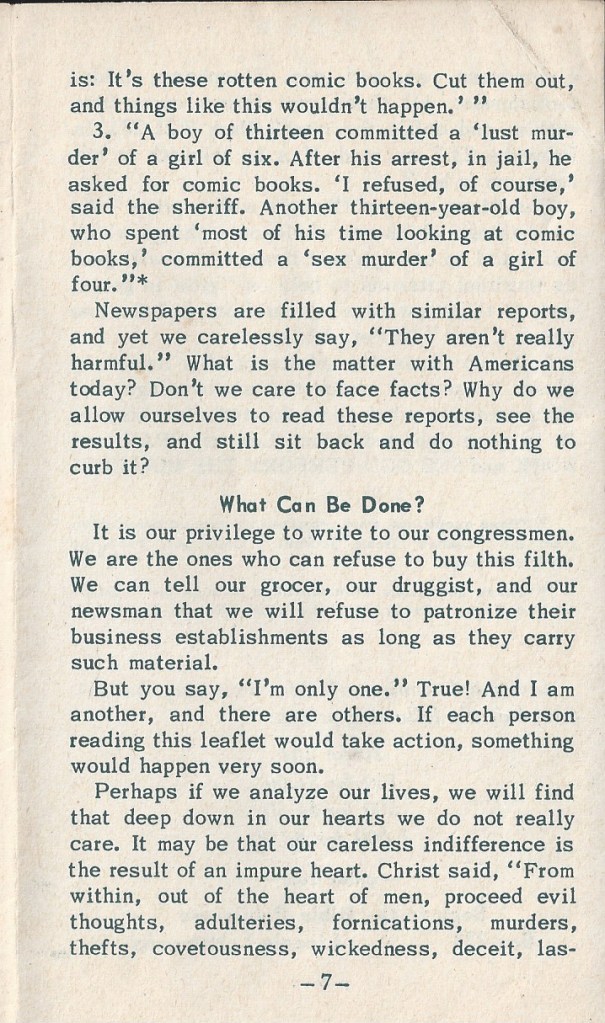 Here is an interesting oddity: a pamphlet created around 1953 extoling the hazards presented to the youth of America by the scourge of comic books. This sort of propaganda added fuel to the fire being espoused by folks like Dr. Frederick Wertham, and led over time to the televised Senate Subcommittee Hearings on Juvenile Delinquency, at which comic books were put forward as a leading cause, and ultimately the creation of the Comics Code Authority, which sanitized the medium for a generation at least. Copyright information is scant, but it was written by Ruth I Johnson, who would write several devotional books, articles and features, including the Joy Sparton series of Christian books for young readers.