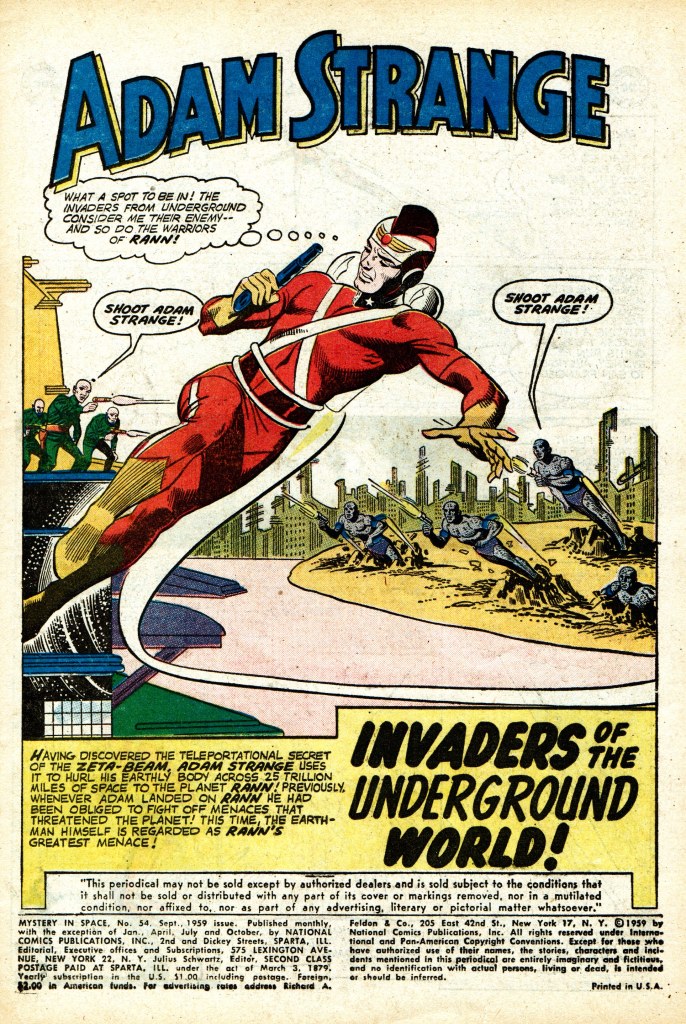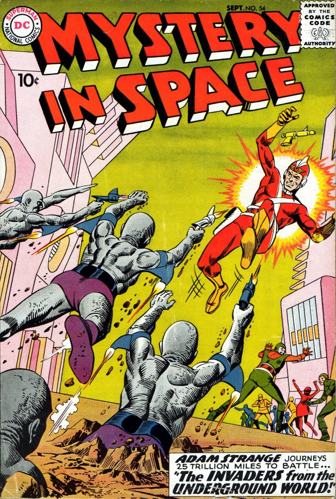 Another title that I got a few issues of in my Windfall Comics purchase of 1988 was MYSTERY IN SPACE. It was one of a pair of titles edited by Julie Schwartz (the other was STRANGE ADVENTURES) devoted to science fiction adventures, a big genre in the late 1950s. This was the earliest one in the box I bought, the second issue to feature the exciting new character Adam Strange after his initial tryout appearances in SHOWCASE. Apparently, Adam didn’t sell well enough to warrant being launched in a series of his own, but Schwartz liked the concept well enough that he gave the spaceman-from-Earth the cover spot in MYSTERY IN SPACE starting with #53 in 1959. Despite the fact that he would eventually team up with the Justice League of America with some frequency, Adam Strange wasn’t a super hero series at all. It really had its roots in the Edgar Rice Burroughs John Carter stories concerning an Earthman transported to Mars/Barsoom. Here, the earthman was archaeologist Adam Strange and the destination was a bit further off–the planet Rann, located in Alpha Centauri.
