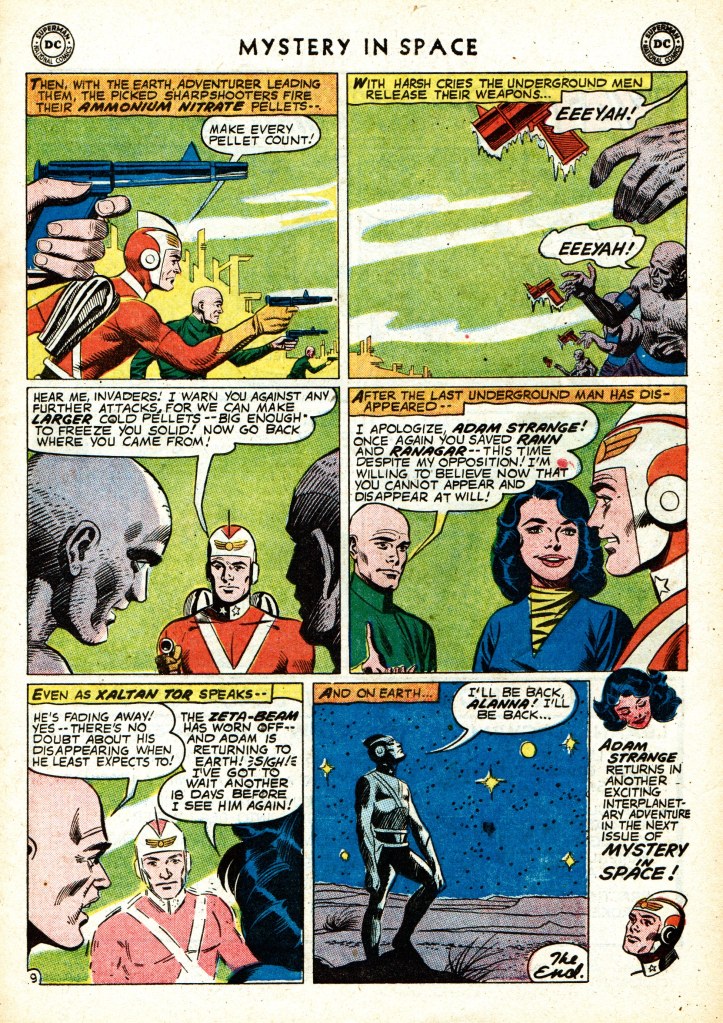 While they would eventually grow in length, the earliest Adam Strange stories in MYSTERY IN SPACE occupied only nine or ten pages–the one in this issue was nine. But they packed a lot of adventure into a short space. In this one, having caught teh Zeta-Beam once more, Adam finds himself accused of stealing weapons from Ranagar, the capital city, and is exiled from Rann. He discovers that the true culprit is a race of subterranean stone men, who purloined the weapons in order to test them in advance of their own invasion of the surface world. Finding Adam too weak a foe to oppose him, they send him back to the surface to warn his fellows of what is to come. But Adam, as always, has a plan. He’s worked out that the underground beings are used to living in a hot climate, and so he uses Ammonium Nitrate pellets against them, which draws out the heat of their bodies and paralyzes them. His innocence proved and the day having been saved, Adam is teleported back to Earth in typical fashion before his accomplishment can be celebrated.