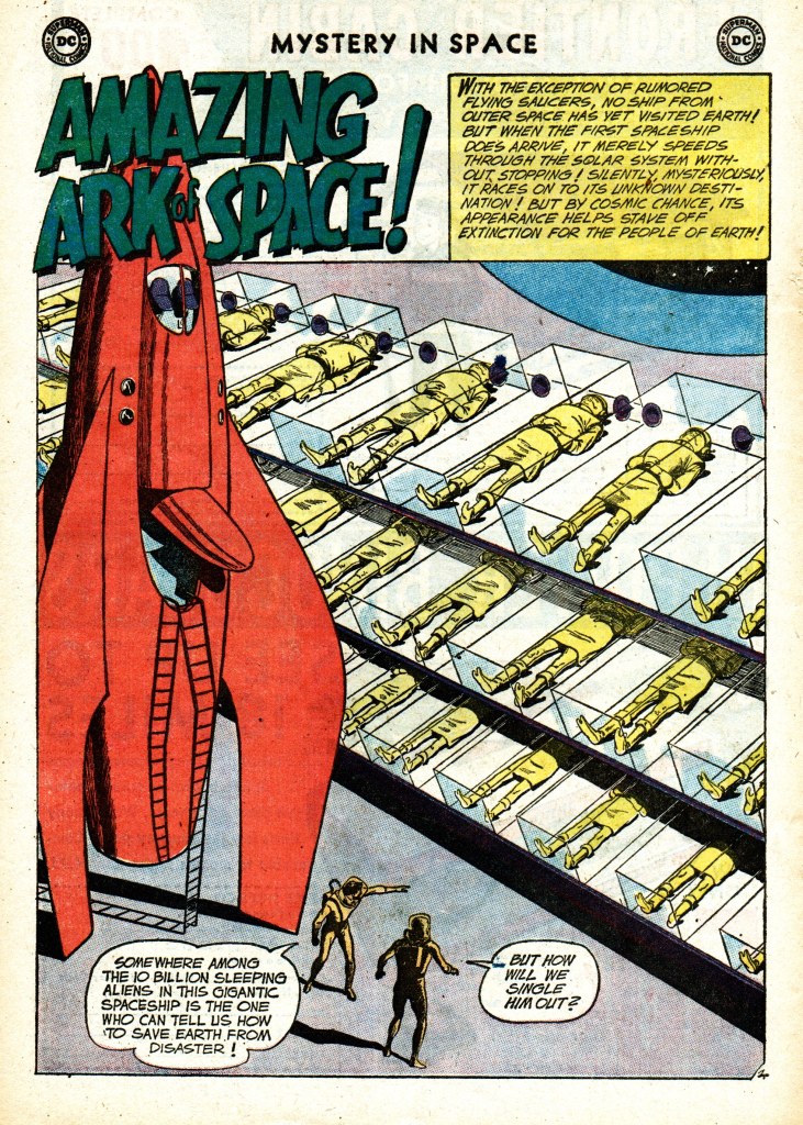 While Adam Strange had commandeered the front pages of the magazine, the remainder of it soldiered on as it had been doing, with single one-off self-contained stories of a science fiction nature. This next one was written by Otto Binder and illustrated Sid Greene. Greene would go on to be largely an inker as the Silver Age got into full swing, but he started out as a penciler as well. His work had an appealing cartooniness to it–I can see why it wouldn’t be considered suitable for a super hero strip, but it always worked well for the kinds of quirky sci-fi tales that Schwartz would give him to illustrate. This one’s a pot-boiler about the simultaneous discovery of a titanic space ark at the edge of the solar system at the same time Earth is imperiled by cosmic doom. The two astronauts who discover the ark learn that they can mentally question three of its ten-million frozen inhabitants in the hope that the aliens may know of a solution. And they do! But the two astronauts need to select the correct solution out of teh three offered, as only one of the beings they questioned is a scientist and knows what he’s talking about. Of course, our boys are savvy enough to figure it out, and the Earth is saved.