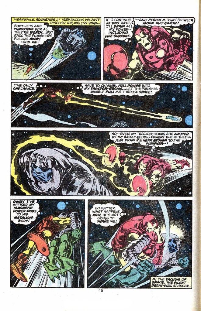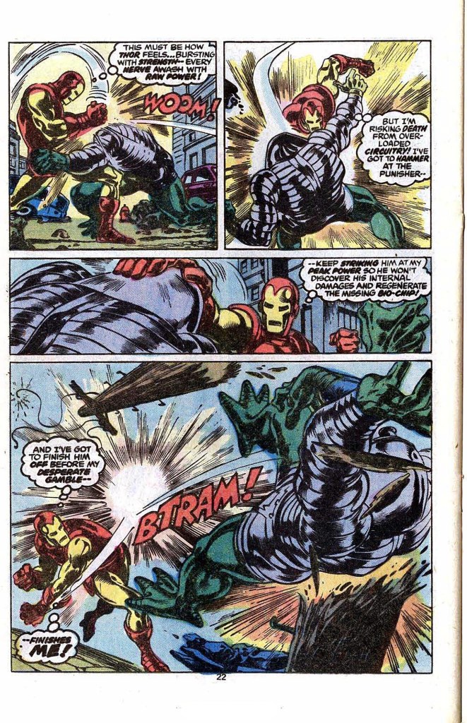 Tony is able to recognize that, while it outwardly seems to be in fit fighting condition, the Punisher must have been hurt by that missile explosion, and he engages with the creature. What follows is an extended fight scene in which Iron man uses all of the assorted tricks in his arsenal (including his roller skates) but still isn’t able to put a dent in teh rampaging monstrosity. As a last ditch measure, he turns off teh safeties in his armor, routing every bit of power he can muster into it all at once. It’s dangerous, and may be fatal, but this will allow Iron Man to strike, at least once, in the same weight class as Thor. And so he puts his all into a single blow–and is able to fell the Punisher. And fortunately, the strain on his systems doesn’t cause them to explode, and his synthetic heart is also able to stand the strain. So that’s Iron Man’s part of the battle finished. But he wonders what’s happening with Jack of Hearts and teh others up on the moon.