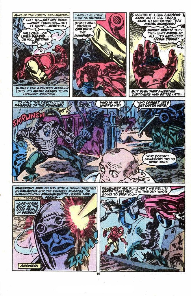 Mantlo had no doubt been inspired by the juggernaut that was STAR WARS in deciding to send the armored avenger on a space adventure for several issues, and he populated the story with a menagerie of disparate characters drawn from Marvel’s past. Among them were Darkstar and the Soviet Super Soldiers, characters whom Mantlo had developed in CHAMPIONS, as well as his pet character Jack of Hearts. There were also the Rigellians, the New Men creations of teh High Evolutionary, Galactus’ Punisher robot, and a bunch of other stuff. having had scant contact with most of it, it was a confusing mess of backstories and difficult to keep straight. More importantly, it was hard to connect to any of these characters–including Tony Stark in this issue–and to feel emotionally invested in what was going on. That last part is the key: it can be fun to do a story that pulls on different strands of teh web of connections that is Marvel continuity. But if teh reader isn’t invested in what’s going on, then it all reads like an encyclopedia entry, and the book gets closed in dissatisfaction.