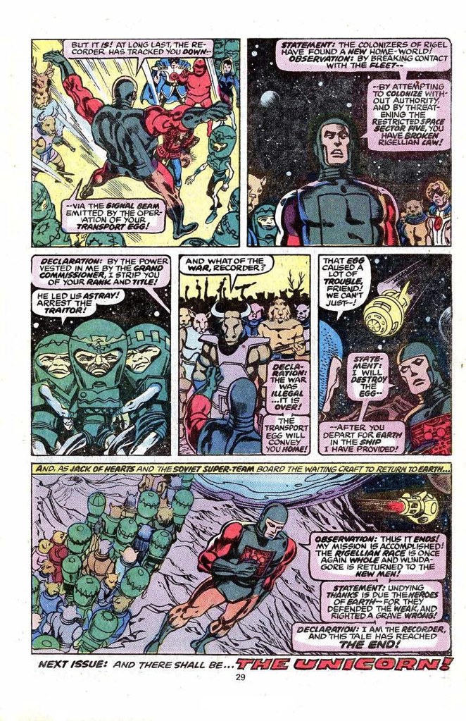 And so, our narrative eyes shift back to the moon for the wrap-up, where a Rigellian Recorder suddenly descends from teh sky. He declares that Arcurus’ campaign–both to claim Wundagore Ii and this aggression against the Earth–is illegal, and he strips the Commander of his rank and title and declares the war finished. The cosmic egg that created the rift in space will be used to get the combatants back home and then destroyed. And so teh story finishes up, with the Recorder praising the heroes of earth for their valiant actions. It’s a pretty lifeless end to four issues of nonsense, and the lead character isn’t even a part of it. But I was happy to see the back end of this story, so I was fine with it.