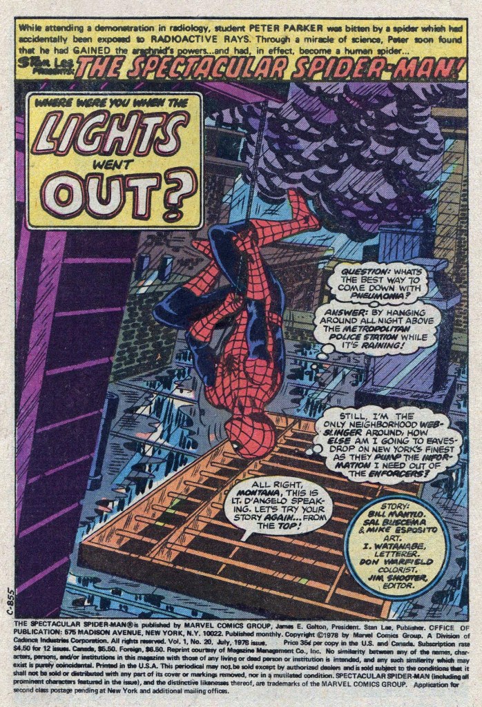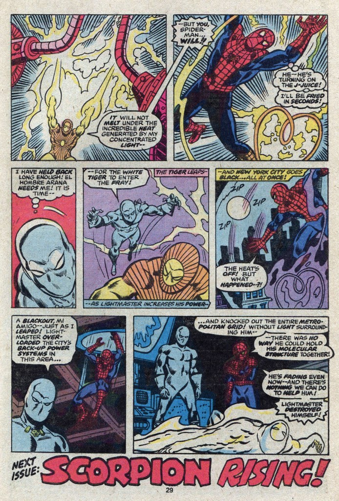 And then it was action time! The White Tiger holds back at Spider-Man’s request (he also needs to recover a bit from being without his amulets.) Even so, the now juiced-up Lightmaster is more powerful than ever, and gives Spidey a run for his money. At one point, the wall-crawler ducks into what he thinks is an internal duct, but which ends up being the entrance to the huge lightbulb on the rooftop. Lightmaster powers up the bulb, intending to fry the web-slinger with it–and it almost works, But what undoes him is that he’s sucking enough power from the New York energy grid that he causes a citywide blackout, just in time to save Spidey. What’s more, the loss of power zaps Lightmaster himself, whose energy-based form can’t keep his cohesion. He’s apparently dying–though he’d come back again in the years to come. And that’s the issue, bim, bap, bop! It wasn’t particularly consequential (except to the White Tiger, ironically enough) but it was entertaining and well-told, and in particular Mantlo handled the Peter Parker material nicely. PETER PARKER, THE SPECTACULAR SPIDER-MAN would continue to be a bit up-and-down, but in Mantlo’s hands it was more usually up than down.