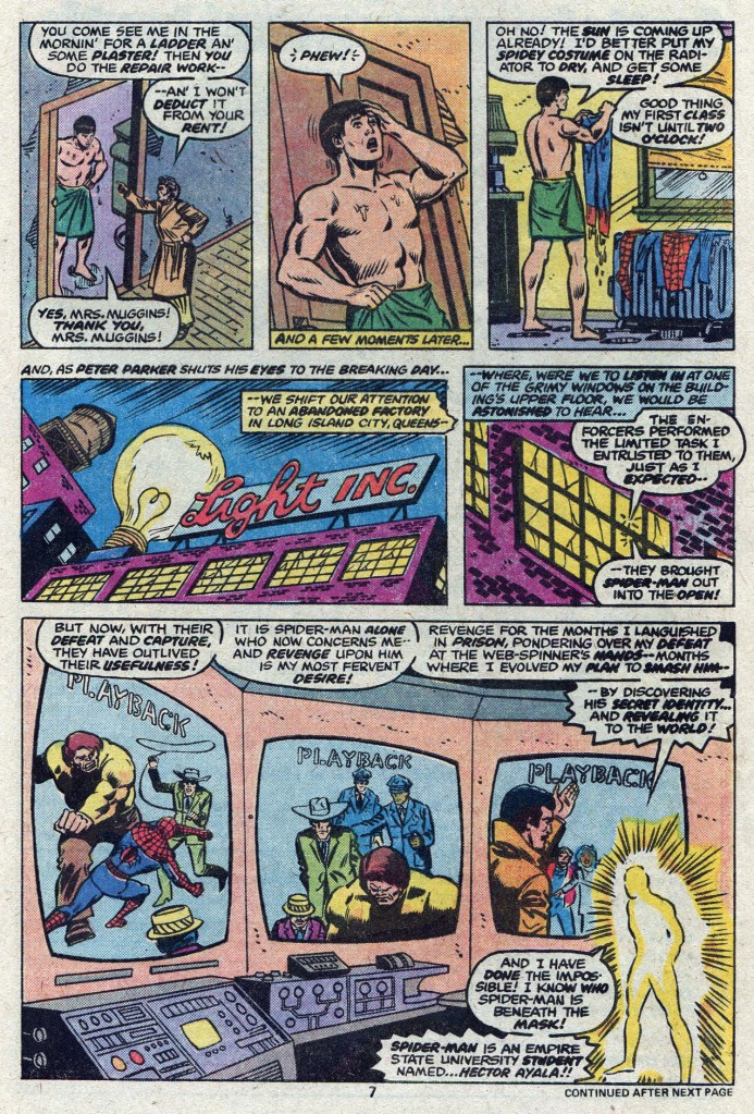 So, last time, in a bit of sitcom plotting, Lightmaster had engaged the Enforcers to lure Spider-Man out into the open, to better determine the wall-crawler’s true identity. Spidey did show up to the hostage situation to take care of business, but in the way it all played out, it looked to Lightmaster like Hector Ayala, secretly the White Tiger, was actually Spider-Man. We pick up this time out with the clean-up from last month’s adventure, with the cops questioning the Enforcers but learning nothing about their benefactor. Thereafter, Pete swings back to his apartment, only to have the plaster of his roof collapse under his weight. This leads to a testy exchange with his landlady Mrs Muggins–the Spidey books used to have a wide variety of recurring incidental characters like here, which gave the strip a bit more texture. It’s a factor that I wish we could get back to more, and not just in the Spidey books.