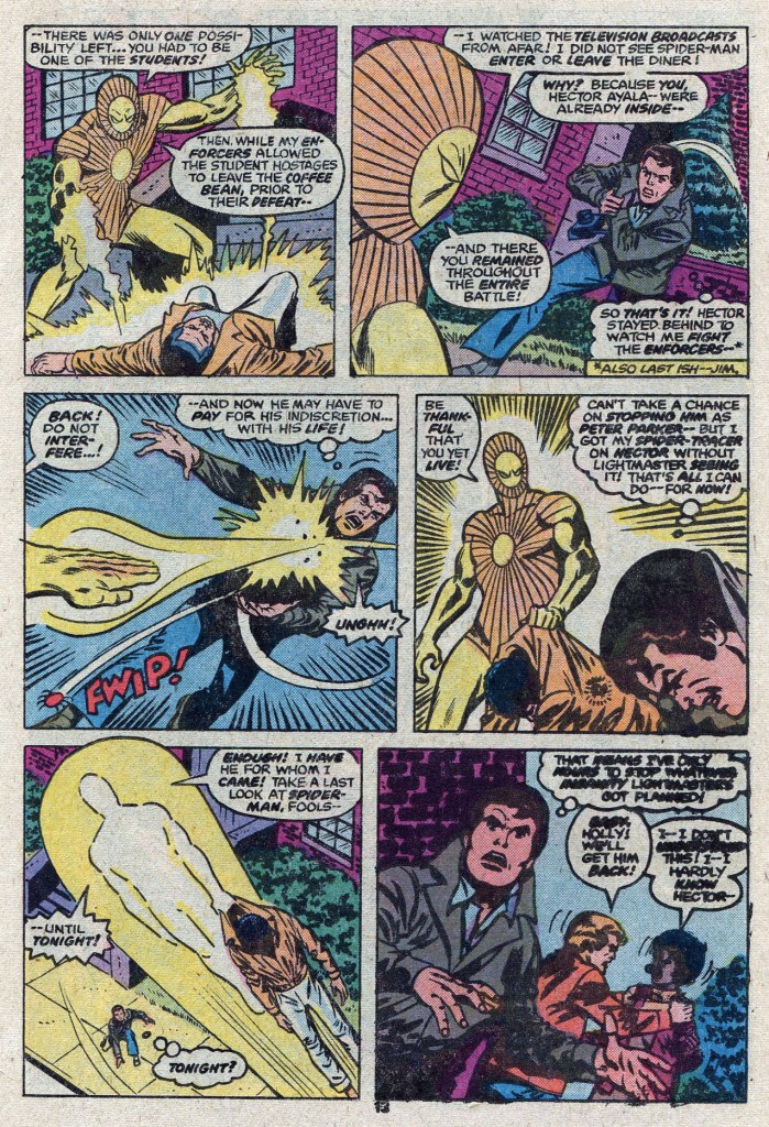 This issue picks up where the previous outing had left off–and I ought to mention that Ernie Chan’s cover is really quite attractive and well done. Chan was hit-or-miss for me as a super hero cover artist, with more misses during that period when he was drawing virtually every DC super hero cover in the line. But this piece is sharp, with a bit of a Ditko flavor in the harsh contrast lighting. It even helps to make Lightmaster, one of Gerry Conway’s last villainous creations and a bit of a turkey, come across as halfway formidable. Lightmaster was another one of Mantlo’s reclamation projects–as I said, he’d pick up anybody he could get his hands on, and the luminescent villain had debuted in SPEC SPIDEY, meaning that it was considered his “home series” and so Mantlo could develop him in ways he maybe couldn’t with the other Spider-Man big gun foes.