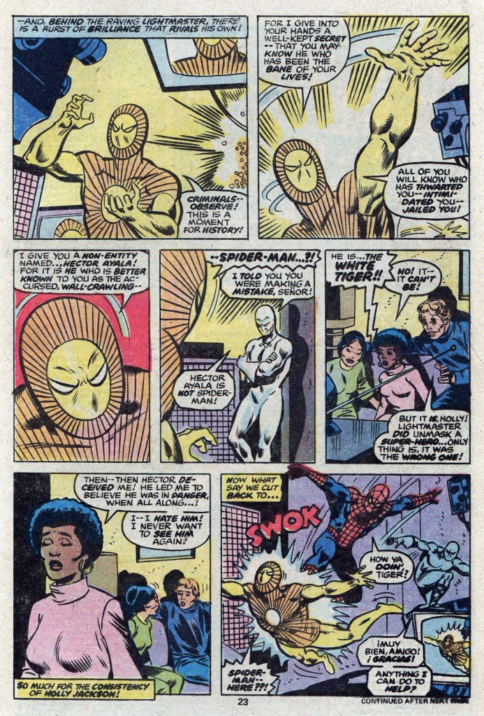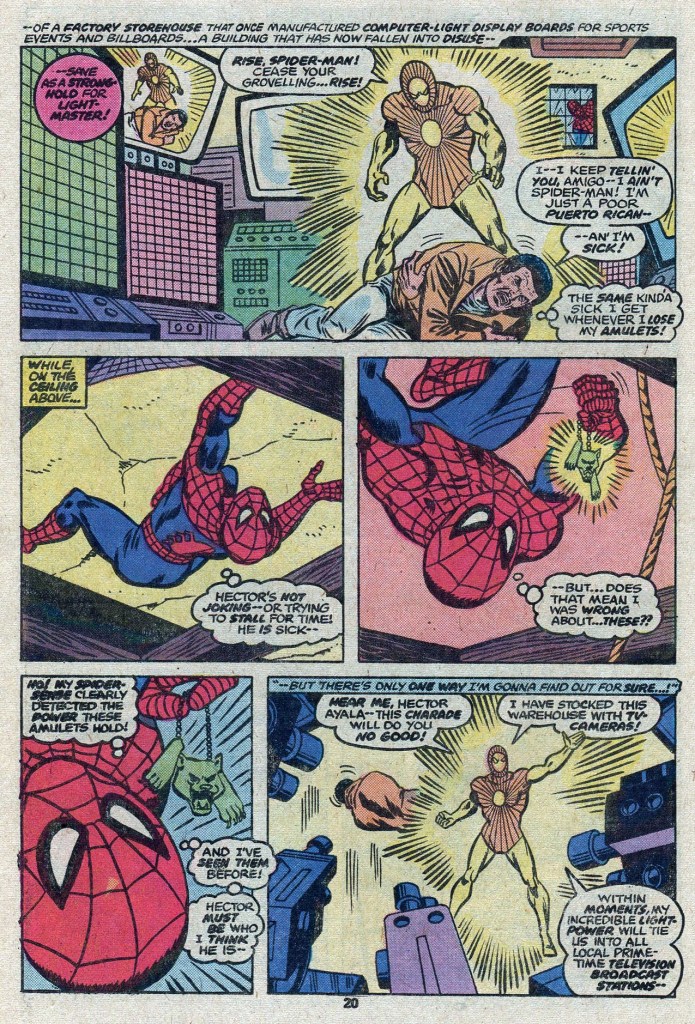 So, anyway, the next day Lightmaster seeks out Hector Ayala on the ESU campus, ambushing and attacking him in front of his friends, including Peter Parker. Lightmaster, it must be said, possesses one of the lamest designs for a villain ever–there just isn’t anything to it, and as finished by Esposito, he just doesn’t look good. But why let that stop him/ Lightmaster blasts Hector, which accidentally causes his White Tiger amulets to come loose, preventing him from becoming his heroic alter ego. And while Pete watches, unable (or, really, unwilling) to do anything to jeopardize his true identity, Lightmaster hauls the unconscious Hector away to an uncertain fate. Pete swiftly suits up in his web-swinging togs and goes after the duo, locating them in a Bill Finger-style company called Light, Inc, which includes a huge lightbulb as a part of its display sign. Hector’s lady Holly passed Pete Hector’s discarded amulets–and Spidey recognized them as belonging to the White Tiger, whom he’d fought beside before. So he’s brought them along, figuring that they might provide him with some back-up.