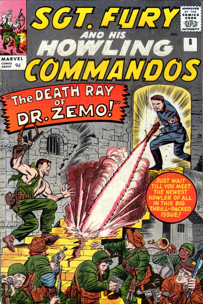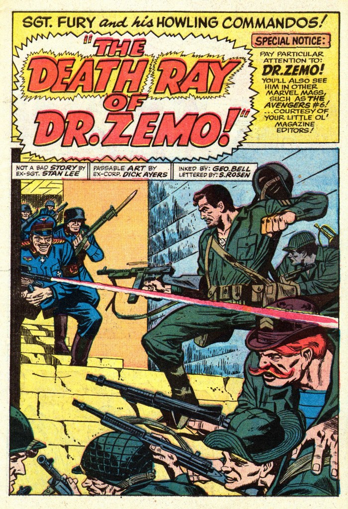 This issue features “The Death Ray of Dr. Zemo” and ostensibly featured the same villainous character who was concurrently bedeviling the newly-formed AVENGERS over in their own title, as this house ad illustrates. Having read both stories, I am absolutely convinced that the decision to name teh evil Doctor in this story Zemo and to make him the same guy as was appearing in AVENGERS was a late-in-the-game brainstorm, a way of promotion SGT FURY among the other Marvel books, particularly the good-selling super hero ones. There isn’t anything much in this story (apart from the fact that the scientist creates a death ray) that connects the character here to the Dr. Zemo in AVENGERS. I feel confident that Ayers drew this issue with him being just another random Nazi scientist. But it was a clever bit of cross-marketing for Lee, who was increasingly starting to figure out eh benefit of an interconnected Marvel Universe. Also, just for the record, Zemo didn’t become Baron Zemo until he was later brought back–in all of his early AVENGERS appearances, he is simply Doctor Zemo.