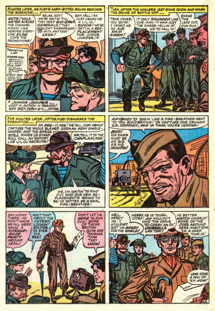 A couple of issues earlier, Kirby had shockingly killed off one of the central Howlers in an unexpected and understated fashion. This was “Junior” Juniper, who never came back, astonishingly enough. As this story opens, the squad gets its replacement for Junior–the cartoonish Percival Pinkerton, who was based visually and stylistically on David Niven. Now, in later years, scripter/editor Stan Lee claimed that Percy was intended to be gay, but that’s honestly a load of crap. He was de[icted as seemingly foppish, a bit of a dandy in the stereotypical American approach to what constituted Englishness, but he was also pretty definitively straight. So let’s put that particular bit of misinformation to bed. Percy never failed to go into action accompanied by his trusty bumbershoot, which he’d use in a number of logic- and physics-defying ways in combat.
