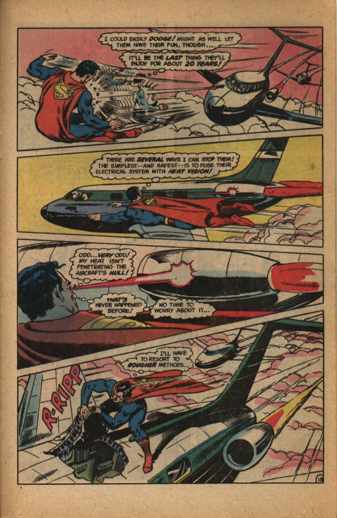 This is also the story that changed Clark Kent’s vocation from being a newspaper reporter to a television broadcaster. Schwartz reasoned that most people in the 1970s got their information from the nightly news. This would be Kent’s occupation throughout the decade, until the arrival of SUPERMAN THE MOVIE would prompt DC to shift him back to newspapers, at least semi-regularly. But here, Edge orders Kent to broadcast remote coverage from the launch of a new transcontinental mail rocket. As he does so, he detects bad guys planning to heist the rocket, and during a commercial break, he changes to Superman–clearly, being on camera is going to be more of a headache when Clark needs to go into action (to say nothing of the fact that it will make Clark’s face well-known to everybody in Metropolis, and thus make it more difficult to maintain his dual identity.) Anyway, Superman gets the drop on one of the villains, who pulls out one of thos eubiquitous bits of kryptonite–leading to this genuinely amusing scene.