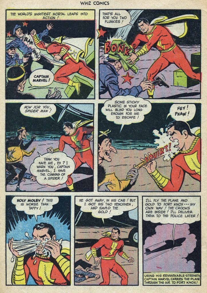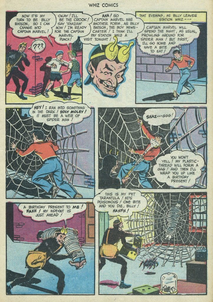 I do feel bad for that innocent tarantula that Captain Marvel squashes here. He wasn’t doing anything other than following his instincts, and Marvel was in no danger from him (unlike his alter ego) so this seems just a little bit cruel of Marvel.