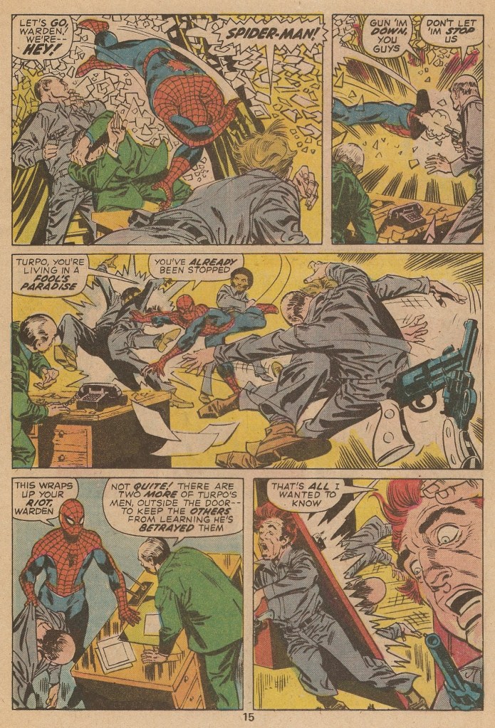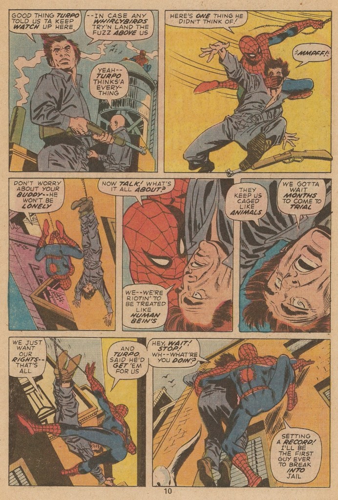 When the web-slinger gets there, he learns that the cons are rioting for better conditions–he’s told that the inmates wait months for a trial date. This was a situation that was in the press in the early 1970s, an issue of interest to the activist college age crowd that Lee had been courting, and so he has Spider-Man take it on here, as a follow-up to the anti-drug storyline. The riot has been organized by a con named Turpo, who is really only interested in escape, and who has taken the warden hostage. (This whole scenario is a bit reminiscent of AMAZING SPIDER-MAN #65, except in that instance, Spidey himself was behind bars, and it was Captain Stacy who was taken hostage.) Anyway, the web-slinger comes crashing in, and makes quick work of Turpo and his henchmen.