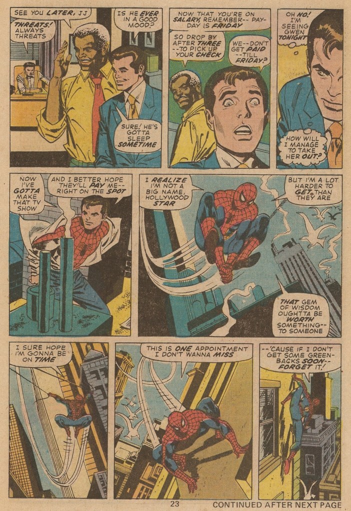 At Spidey’s urging, the now-freed warden begins to listen to the rioting con, and the conflict comes to an end. The warden expresses to the press that they need better funding in order to improve conditions–which make Spidey remember that he needs to get paid in order to take Gwen out that evening. As he races across the city, he’s flagged down by, no kidding, Johnny Carson. Carson is never named in this story, for legal reasons, but Kane does a pretty accurate caricature of the popular talk show host. Carson wants Spidey to appear on the Tonight Show that evening, to capitalize on the press from the riot, and the wall-crawler sees this as an opportunity to bring the situation in the prison system to wider attention. But first, he heads back to the Daily Bugle to drop off his pictures and pick up a check–only to learn that, as a salaried employee rather than a freelancer, he’s going to get paid every Friday, which doesn’t help him at all today. So that TV appearance suddenly has a second importance, in terms of being able to put some money in his pocket. (Spidey has apparently forgotten one of his first experiences, when he tried and failed to cash a check made out to Spider-Man. )