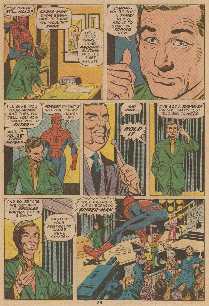 Spidey gets to the TV studio just in time, as the taping for the Tonight Show is just beginning. After an introduction from Carson, Spidey comes swinging in, performing a series of stunts reminiscent of the story in AMAZING FANTASY #15 when the wall-crawler made his first public appearance. And then, having proved his bonafides, Spidey talks about the need for prison reform–only for the taping to be broken up by the arrival of the police. See, Spidey is still wanted in connection with the death of Captain Stacy, and not wanting to tussle with the cops, he needs to book on out of there–and again without getting paid for his efforts.