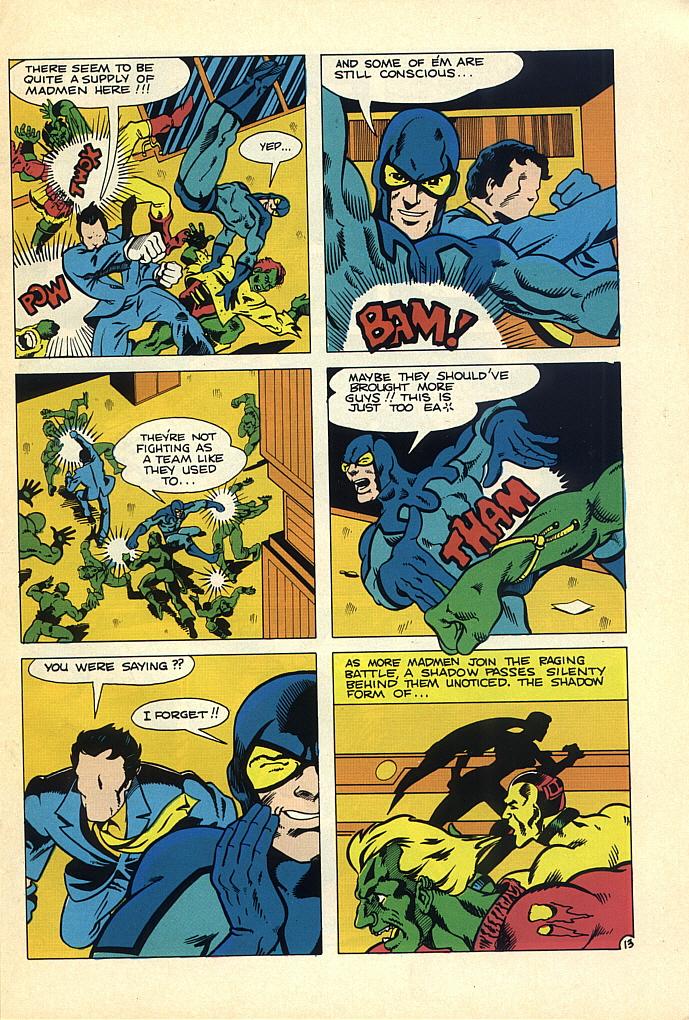 Black pivoted almost instantly, gathering together a bunch of his own characters for a back cover pin-up and christening them the Sentinels of Liberty. He even used the same logo for them, at least at the start. Meanwhile, the Charlton heroes were introduced into the DC Universe in the epic CRISIS ON INFINITE EARTHS series. Their appearance there was one of the things that made the series seem so epic–the Crisis was so vast that it was even affecting the worlds of characters that weren’t a part of DC’s publishing line until then. Once the Crisis had run its course, the Charlton heroes were firmly integrated into the new, unified DC Universe.