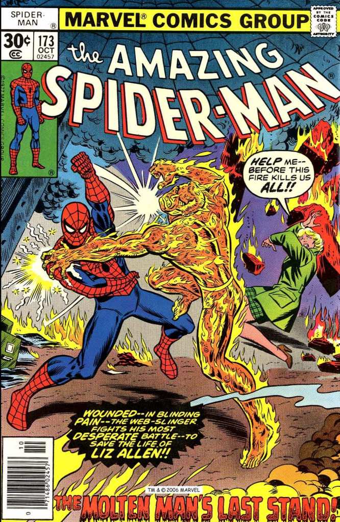 The Molten Man takes the chemicals that Liz had helped to supply him with to a pharmaceutical technician, who can help him to create the antidote to his condition (Molty himself is too hot to mix the chemicals safely.) And it seems to work for a moment–but ultimately, after a brief respite, Mark Raxton begins to burn again, and all hope is lost. He realizes then that he is dying, and half out of his mind, he demands that his step-sister Liz is brought to him, so that he won’t have to perish alone. Lz gamely goes into the building to talk to Raxton, and Peter becomes Spider-Man so that he can sneak in and see to Liz’s safety. Unfortunately, the sub-par work in the place’s ceiling collapses under the wall-crawler’s weight, and the Molten Man is alerted to his presence.