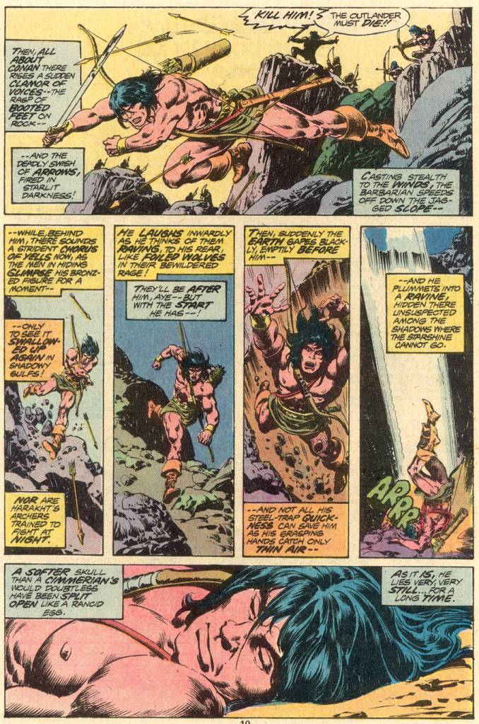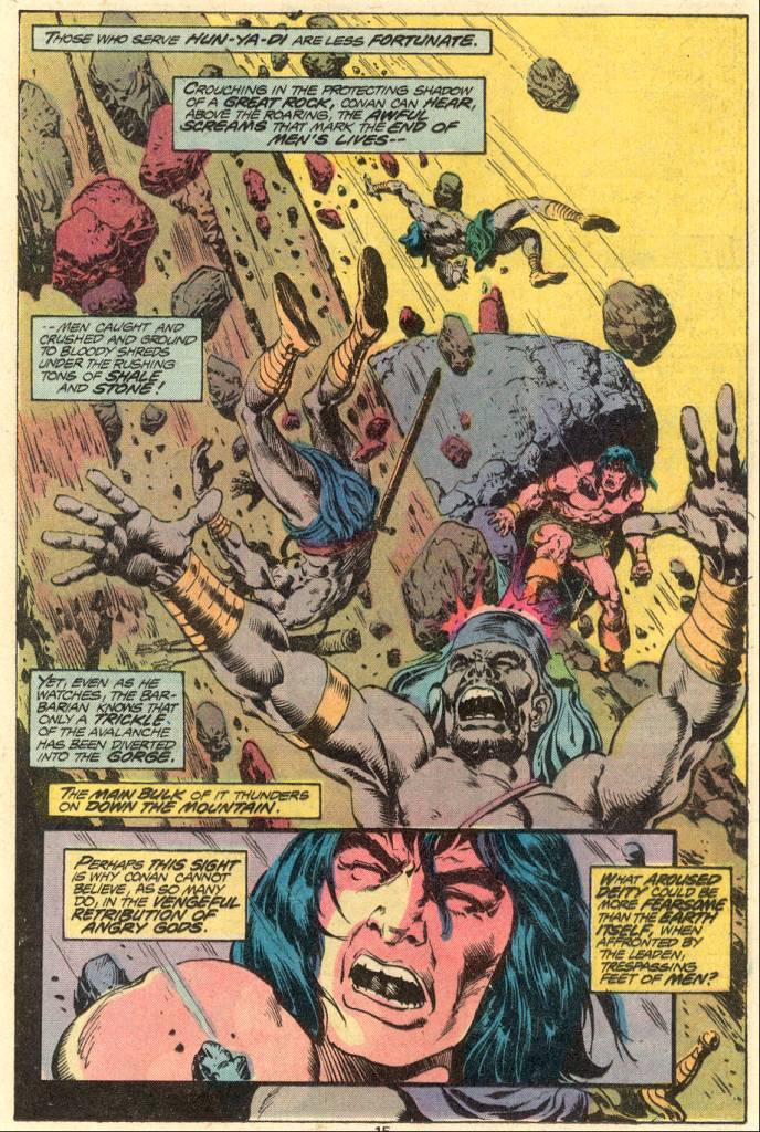 In this particular issue, after a brief preamble when Conan is attacked in his sleep by a warrior bearing a mysterious eye-gem, his minds casts back to a day not long in the past. In order to secure safe passage for himself and his company through Stygia, Conan had taken on the task of conveying a similar eye-gem to the village of Attalus to exchange for another–a ritual that kept the peace between the two lands whenever a new monarch had been crowned. Back in the present, Conan is set upon by additional warriors, and is forced to leap into a ravine to escape their arrows. he clonks his head in the attempt, rendering himself momentarily unconscious. Reviving, he uses his strength and skill to set up a massive avalanche which crashes down upon the pursuing assassins, annihilating them.