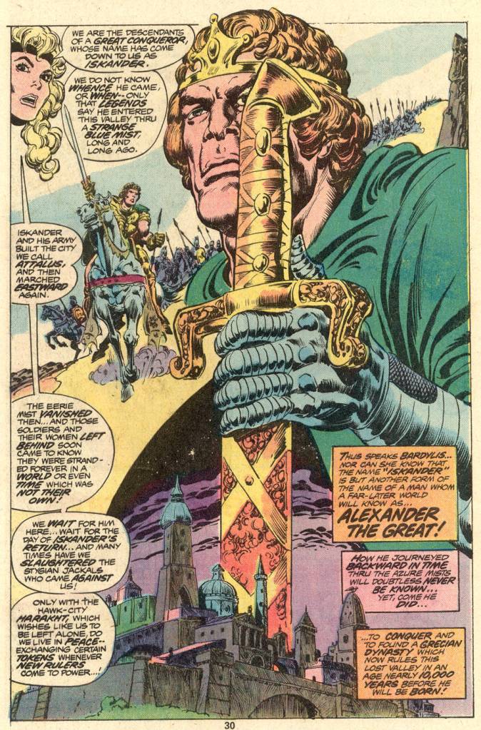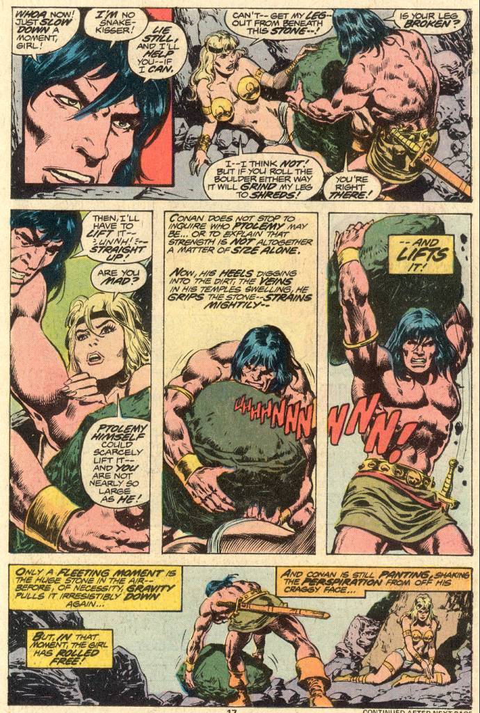 Making his way out of the ravine, Conan comes across Bardylis, a woman who was caught in the same avalanche and now lies trapped underneath a massive boulder. Putting his back into it, and so as not to crush the girl as he attempts to free her, Conan struggles and lifts the colossal weight straight up, allowing her to pull free to safety. But there are still assassins left standing, and Conan and the woman are forced to retreat further. They make for her village, which lies at the bottom of the ravine. This is, of course, Attalus, Conan’s objective. As the pair climbs down the side of the cliff face, using handholds carved there by the men ot Attalus for just such a purpose, Bardylis tells Conan the history of her city–and it is a whopper! Turns out, the place was founded by Alexander the Great, who had somehow passed through some time-travel mist along with a company of his men. Yeah, pretty bananas and arbitrary–I assume that it makes more sense in the original Howard story, but maybe not.