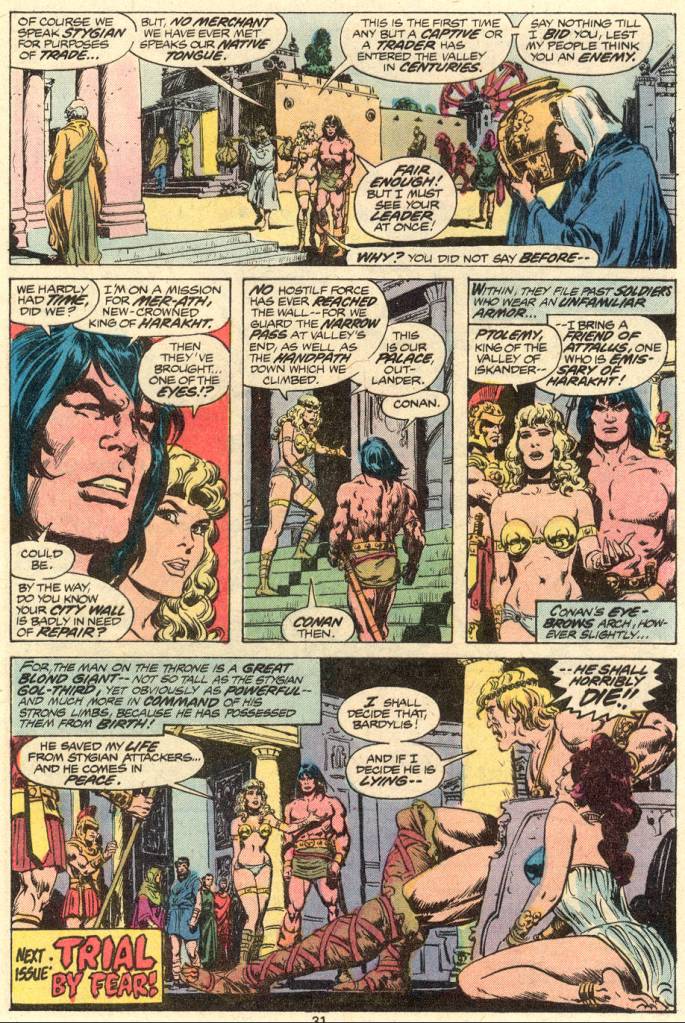 Arriving at the city, Bardylis takes Conan to the royal palace, where he hopes to be able to complete his quest. However, Attalus is ruled by Ptolemy, a blond giant who takes an instant (and unconvincing) dislike to Conan at first sight, and so as to create a compelling cliffhanger for this issue where one hadn’t existed in the story when it was all intended for a single issue of SAVAGE SWORD, Ptolemy declares that, should Conan prove to be an enemy to him and his people, he will die horribly. To Be Continued! The artwork all looked good, and the story constantly moved with action, but it was also weighted down with a ton of heavy captions evoking Howard’s text as well as Roy’s simulations of same, and so I really wasn’t all that engaged by it all. No great surprise there.