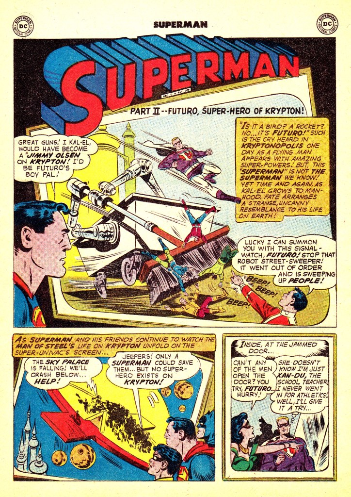 As events play out, we see that another scientist, Zin-Da, prevents Krypton’s destruction. Having shot baby Kal-El into space, Jor-El fires off a second ship to intercept his son’s ship and redirect it back to Krypton. He obligingly also brings Krypto’s earlier space-pod back so that Kal-El will have his pet back. As Kal-El grows up, we see a number of technological innovations along the lines of what would appear in the Jetsons, which makes life easier for the Kryptonians. As a Kryptonian Youth Scout (an equivalent of the boy scouts), Kal-el remotely rescues Jonathan and Martha Kent when their car goes out of control. They’re on their way to adopt a child, a girl in this case. Kal himself gets a younger brother, Zal-El. Growing to manhood, Kal-El wants to become a Spaceman, but the Skill Machine earmarks him in a job as a ground-bound dispatcher.