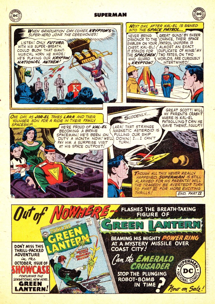 Somewhat later, an accident with unpredictable Super-Static Rays give both Krypto and science teacher Xan-Du super-powers. Attending a costume party in the made-up guise of Futuro, Xan-Du is called upon to save the day when the building they’re in collapses. He decides to keep up his duel identity as effectively Krypton’s Superman, earing an ersatz Superman costume in purple which for no good reason has bare legs. Kal-El, in an Earth costume and looking like Clark Kent, winds up becoming Futuro’s Jimmy Olsen-esque friend, armed with a similar signal watch. But when Futuro is occupied with another disaster, Kal-El proves his daring and heroism by saving an imperiled spaceman. Recognizing his aptitude, Futuo examines the Skill machine, locates a loose connection, and the repaired device indicates that Kal-El will become the ace of the space patrol. So he has his life’s desire. His spaceman uniform, of course, is identical to his Superman costume. The last page of the second chapter includes the above super-cool ad for the first appearance of the revived Green Lantern in SHOWCASE. I’d have bought it!