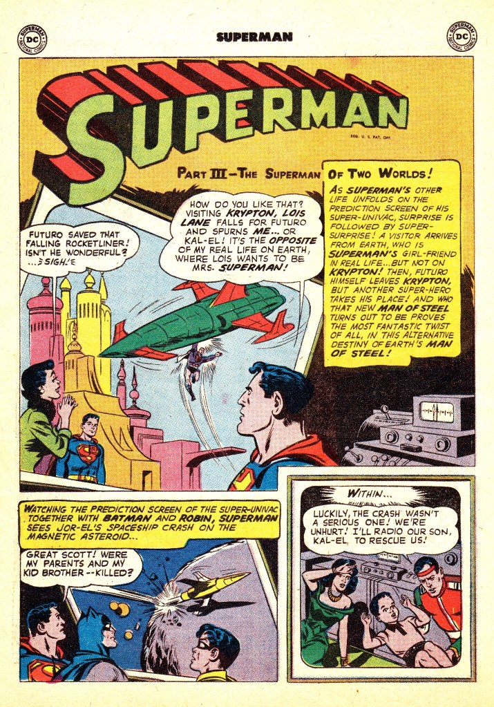 In another bit of a unique feature, this story also features Batman and Robin. Which wasn’t so much of a surprise–the caped crusaders were appearing in stories alongside Superman in every issue of WORLD’s FINEST COMICS. But it was unusual to find them outside their beaten track in this random issue of SUPERMAN. They’ve gone to the Fortress of Solitude to give Superman a gift in thanks for him having saved them from a death trap the previous week. Having wracked their brains to figure out what sort of a gift would be unique for the Man of Tomorrow, they hit upon the idea of having the Fortress’ “Super-Univac” computer hypothesize what Superman’s life would have been like had Krypton not exploded and he had not been sent to Earth. The recounting of that alternate tale forms the spine of the issue.