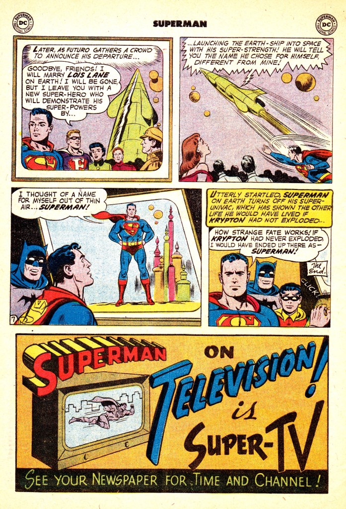 Lois, being a goon as always, winds up activating a “subsurfacer” boring machine that Kal_el is showing her, sending the pair hurling beneath the surface of Krypton and into danger. Kal-El summons Futuro with his signal watch in time to save them–and Futuro finds himself smitten with the earth girl, and proposes to her. Lois accepts, but being ultimately selfish, she wants to live on Earth, so now Futuro will have to relocate. But so as to not leave Krypton without a super hero of its own, Futuro subjects Kal-El to the same charge of Super-Static Rays that gave him his powers and leaves him to carry on the fight in his stead. Kal-El comes up with his new name “out of thin air”–he’ll be Superman, of course! And on that final revelation, this what if adventure draws to a close. It was a harbinger of things to come in the SUPERMAN titles, with its deep dive into Kryptonian culture and the minutia of Superman’s past and history. Even after all of these years, it’s still an entertaining piece–and a good example of how these post-Comics Code Superman stories were able to wring some drama and pathos out of situations that weren’t about overpowering enemies and fighting and violence. Imagination and irony were the watchwords of the day.