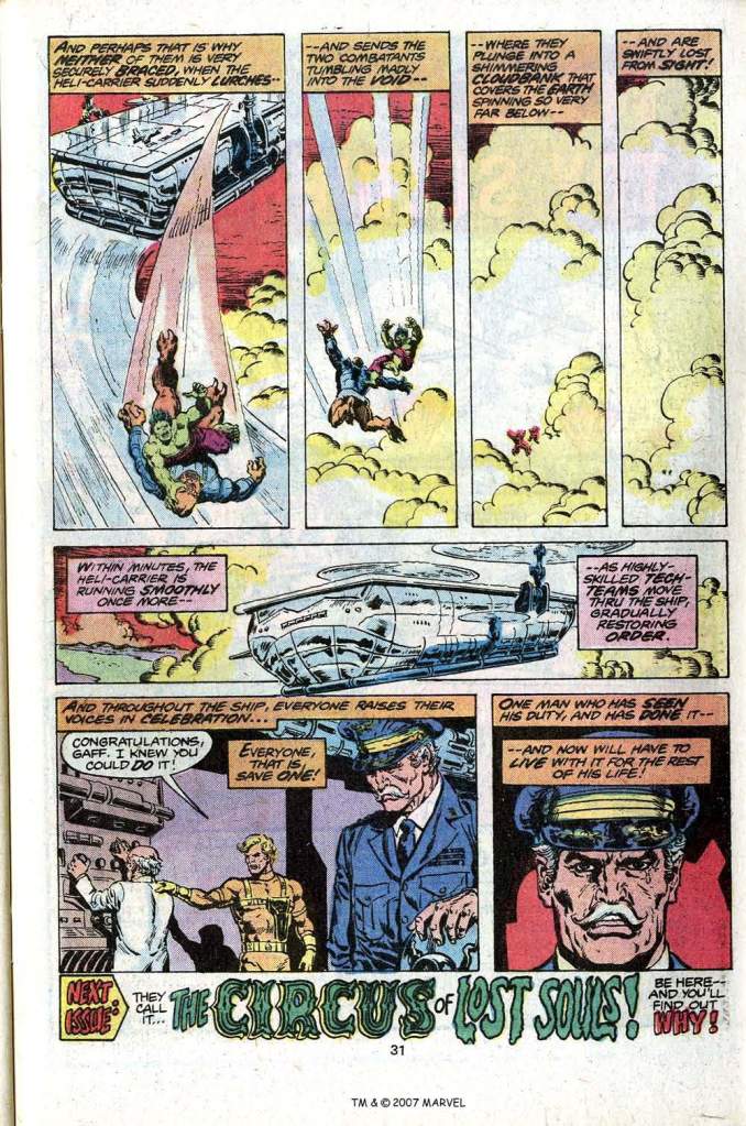 What follows is, of course, a smash-fest of the sort that was the Hulk’s stock-in-trade in those days. The two raging monstrosities battle throughout the Helicarrier, eventually making their way up above deck to continue their struggle on the flight deck itself while Gaffer, Ross and Quartermain attempt to get the ship stabilized. There’s also time for a brief subplot cut-away to Doc Samson and the strange amnesiac who he wound wandering out of the desert–and who here eludes Samson and begins to break into a top security section of Gamma Base. Having read subsequent issues already, I knew that this guy would turn out to be Sam Sterns, the leader, reverted to his non-Gamma form.
