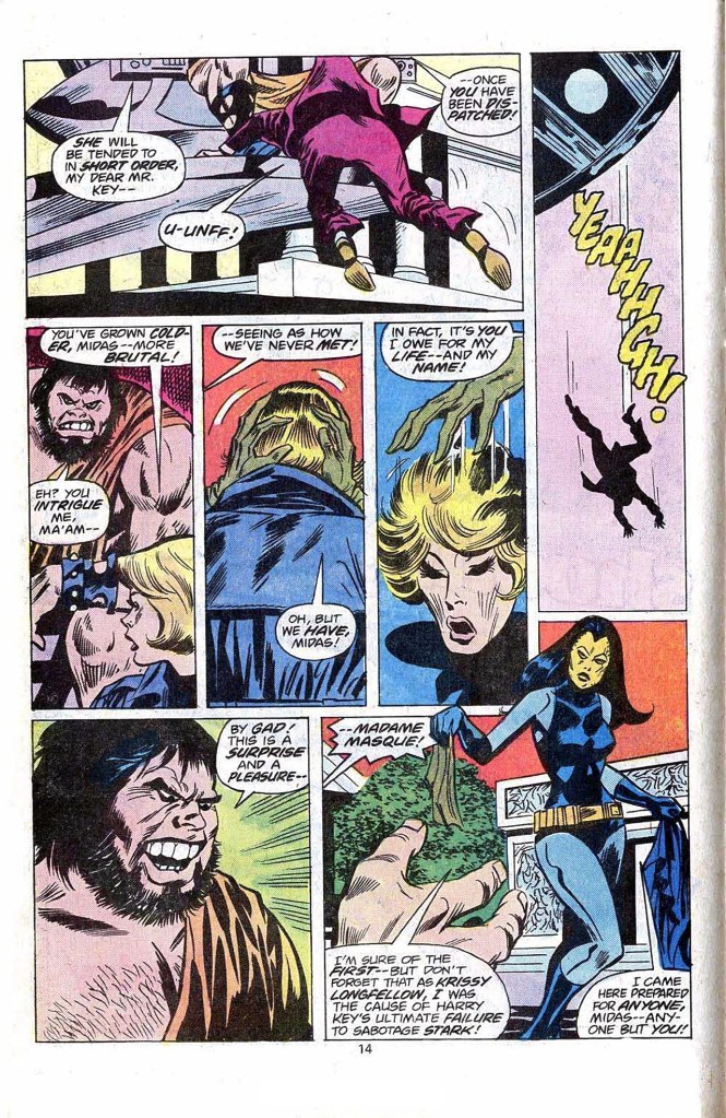 Midas is delighted at this turn of events, and is all too willing to let the two super heroes go to town on one another before he steps in to confront the victor. That turns out to be Iron Man, of course–it is his magazine, after all. He’s also super-pissed about what is going on, and takes out his aggression on the attacking Jack, at one point slashing through Jack’s costume, which contains the uncontrollably zero force that empowers him. But the sudden explosive discharge drains off JoH’s energy, and he plummets towards the ground, rescued by Iron Man at the last moment. It is at this point that Midas reveals himself as the new owner of Stark International. He promptly fires Iron Man, little realizing that it’s Tony Stark he’s addressing under that metal helmet. (And which is a bit of a shame–an iron man who was employed by Midas would have been a fun status quo to play with for an issue or tow.) Tony also learns that Krissy was Madame Masque all the time, and that she was secretly trying to prevent Midas’ takeover. But too little, too late, the damage is done.