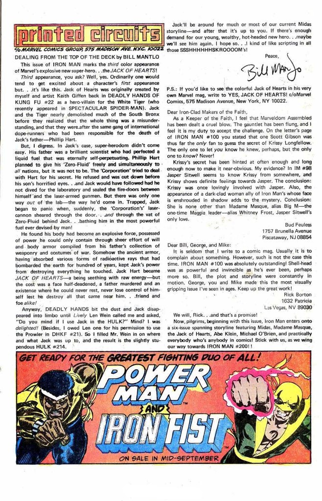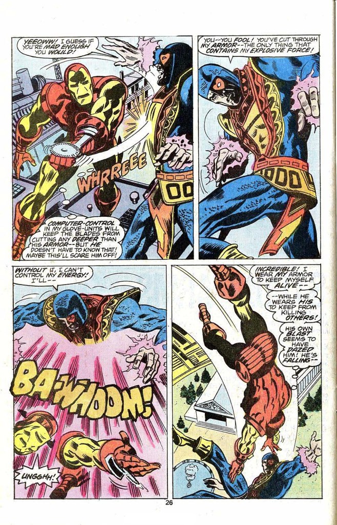 Midas has taken advantage of Tony Stark’s disappearance to take financial control of Stark International through his holding company, Golden Touch. Legally, the place and all of its belongings are his. Midas’ proxy, Mr. Atreus, orders security beefed up around the factory–and just in time, as Iron Man is finally arriving home. Tony isn’t sure just wat is going on, but he’s fired upon by his own security staff, and this pisses him off. Unfortunately for Shellhead, he didn’t take any notice of who was writing his adventures right then. If he had, he might have realized that Bill Mantlo had a pet character that he had introduced in the pages of the DEADLY HANDS OF KUNG FU black and white magazine. it turns out that character has an appointment with Stark International, and he comes across an enraged Iron man attempting to storm the grounds. Misinterpreting events in the manner of every hot-headed Marvel super hero of the 1970s, Jack Hart throws himself into the fray in his costumed identity as Jack of Hearts. And of course, he assumes that Iron man is the aggressor here, and decides that the Armored Avenger is the one in need of a punching out.