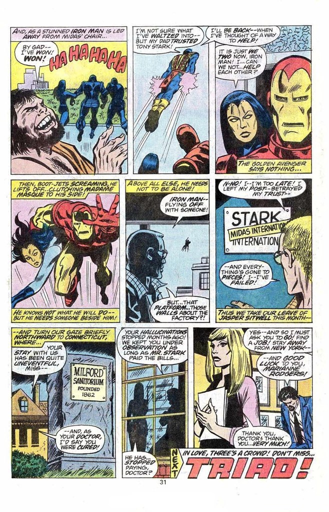 Iron Man just about loses it at this point, and Jack of Hearts and Madame Masque need to hold him back in order to stop him from publicly attacking Midas. Jack tells him that what he’ll need to do is to find Tony Stark, that Stark will need to challenge Midas in court in order to regain his assets. Jack cuts out, but swears to help if he at all can, leaving Iron Man and Madame Masque without any recourse and without even a place to go. As they jet off, the just-arriving Jasper Sitwell arrives from out in the field and is himself crushed by how badly he has failed. And elsewhere ( in a plotline that would eventually be dropped partway through and not resolved for decades) Tony’s former psychic girlfriend Marianne Rogers is being discharged from the Sanitorium where she’s made a recovery from the madness her powers had inflicted upon her. And that’s where this particular story is To Be Continued. It’s mostly lots of juicy subplot payoffs, with a mandatory fight scene in the middle between Jack and Iron Man. But even so, it was a lot more solidly constructed than any number of recent issues of IRON MAN.