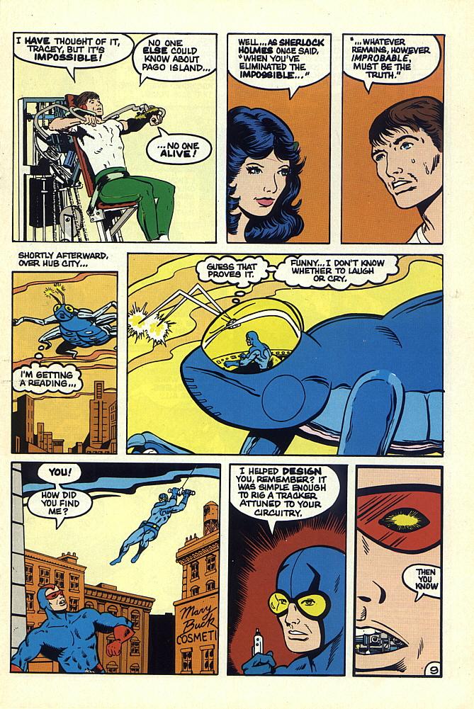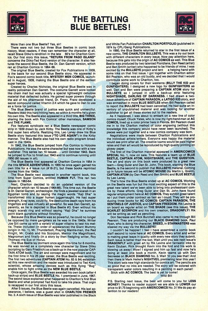 There were fans of both incarnations of the Blue Beetle, of course. One of these was Rik Levins, an artist who would eventually break into the mainstream, where he headed up CAPTAIN AMERICA for a number of years. But in the early 1980s, Levins was just getting started. He’d worked with Black on characters for the new AC line, most notably Dragonfly, and he’d also crafted a story piting the two Blue Beetles against one another for BULLSEYE–a story that was among those languishing in the BULLSEYE slush pile. So it was a natural for AC to make that story the centerpiece of an issue of AMERICOMICS, which functioned as a tryout comic, with a different feature showcased every issue.
